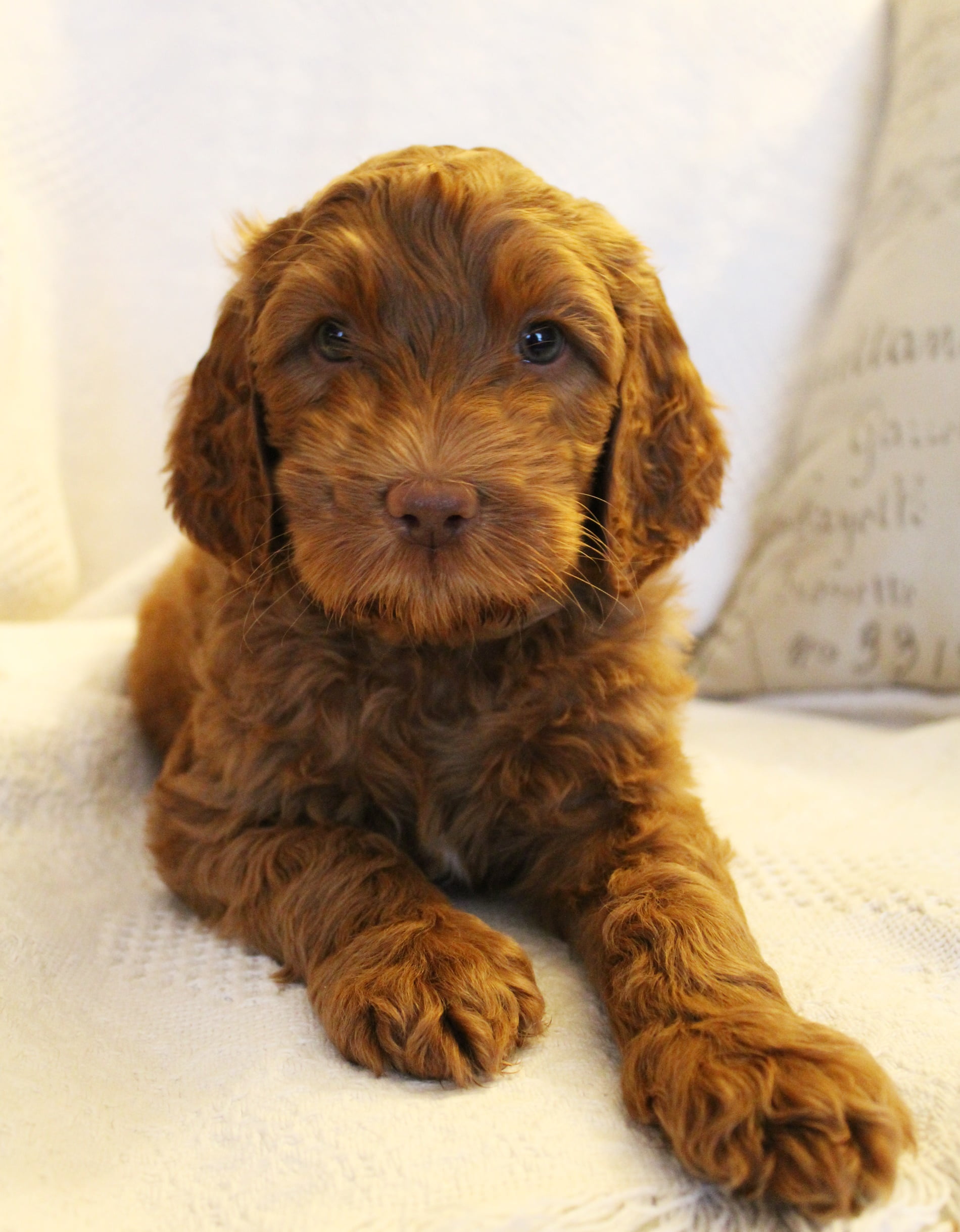 January 19 – 2018 – Ella’s started labor yesterday afternoon and by 11 pm, six healthy puppies had arrived. They latched on to mama quickly and have been nursing and staying close to Ella. All of the pups seem to be doing very well. We have six puppies: two girls and four boys. The colors are red and apricot, and one of the girls could be cream. The colors will lighten or darken over the upcoming days and weeks. Mama is doing well and seems so proud. We can hardly get her to leave them to go potty outside! We’ve themed this litter “Classic Disney” and we’ll post their temporary names when we post their inidvidual pictures next week. The red heat lamp makes it hard to get good pictures at this point, but we’ll keep updates and pictures coming at least weekly as the pups grow and develop.