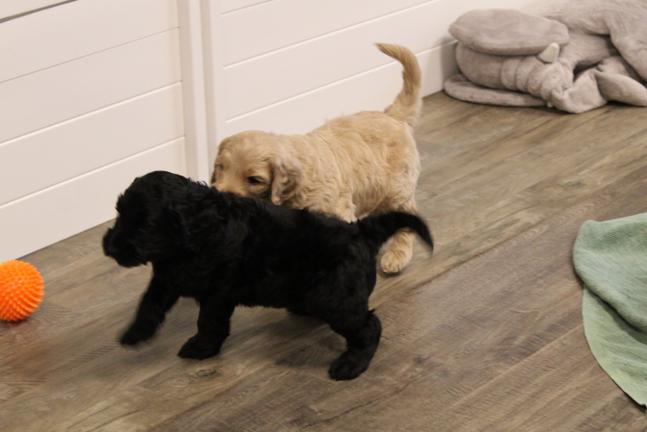 They are very playful and spend a lot of time wrestling and gnawing on each other (something their humans will have to teach them not to do. Gnawing on humans is always what every pup, every litter has to learn NOT to do once they live their litter.