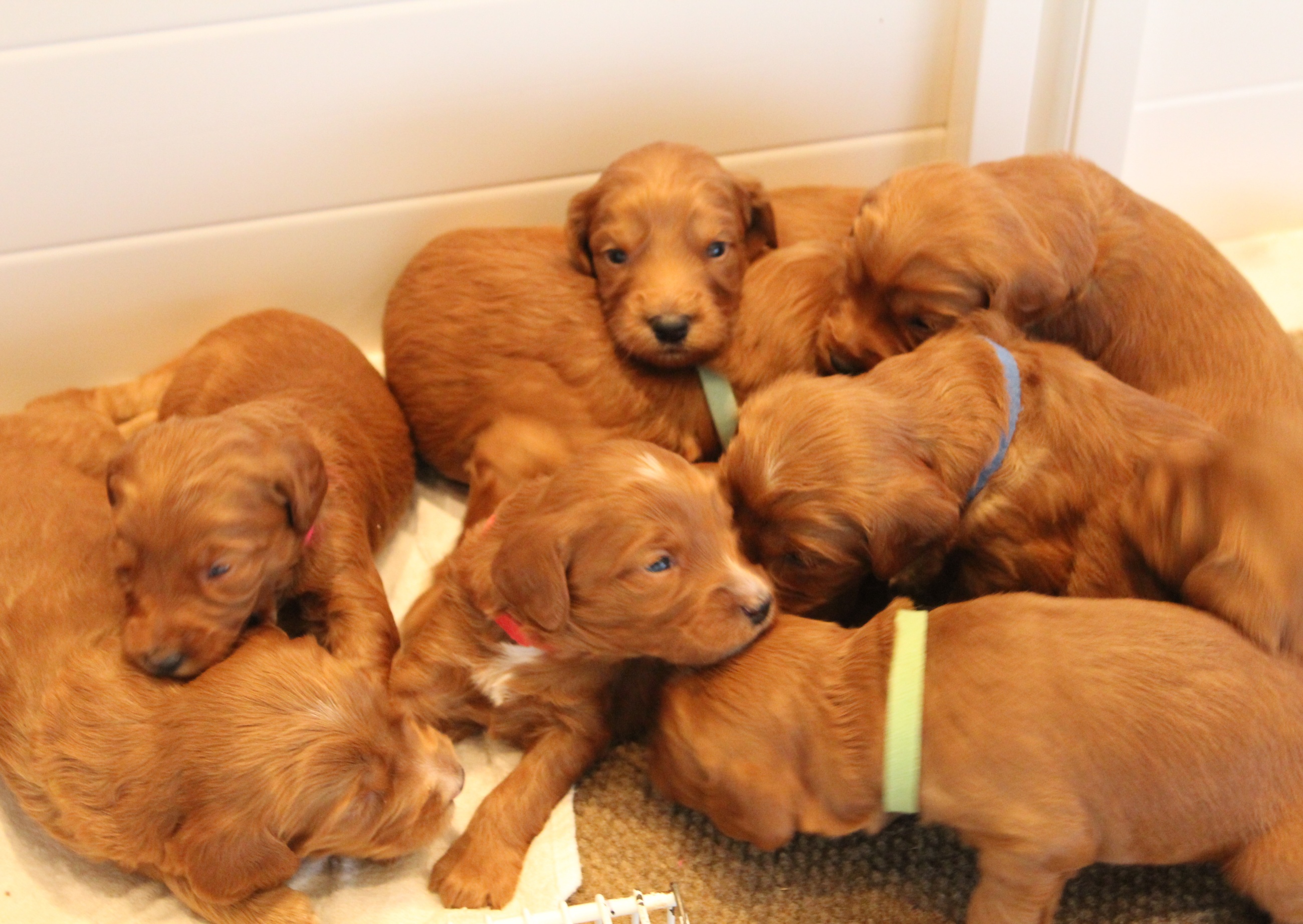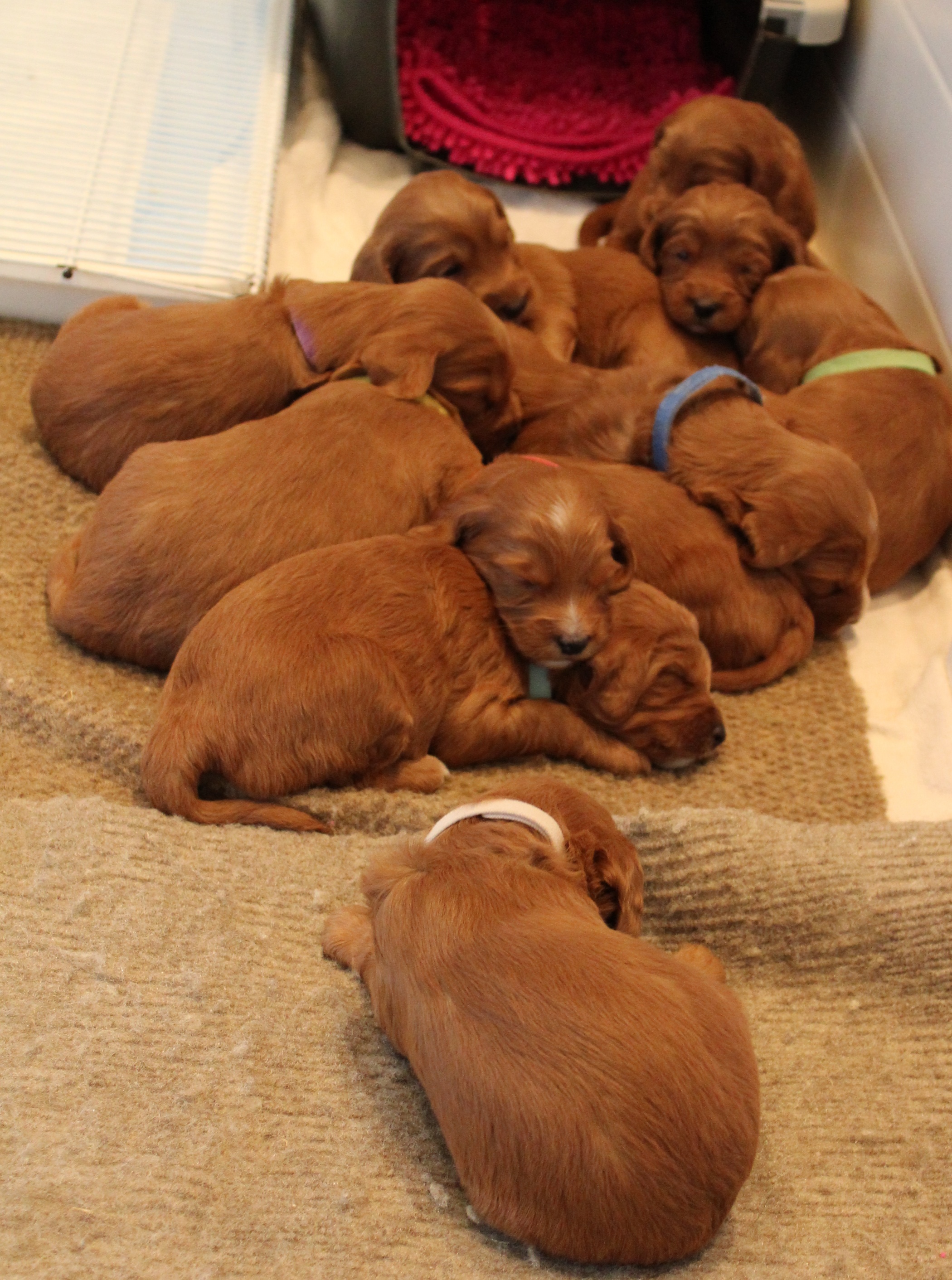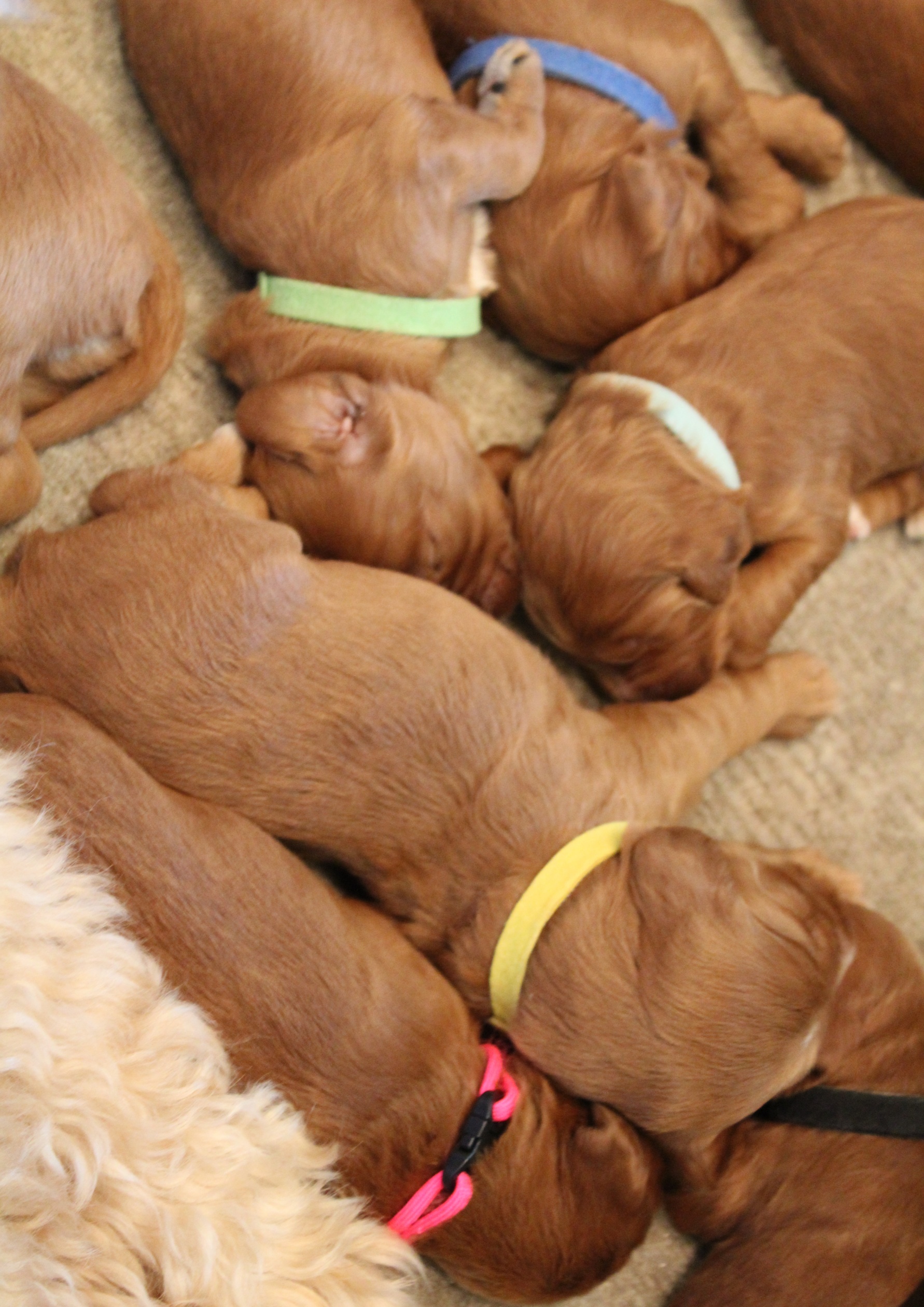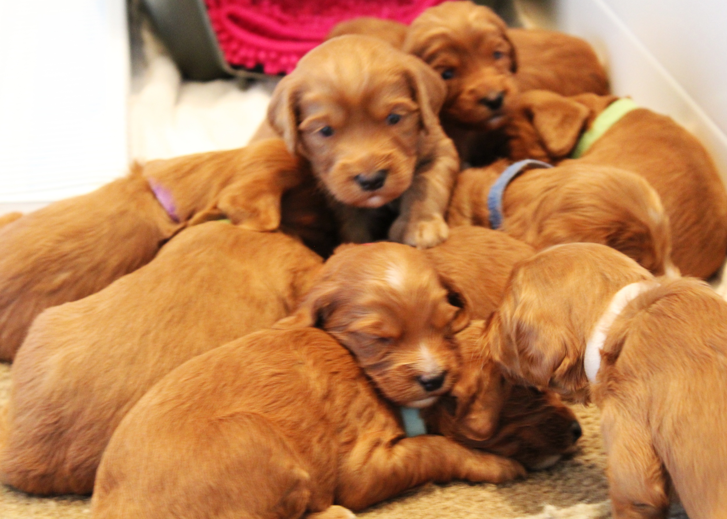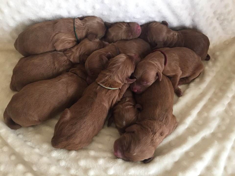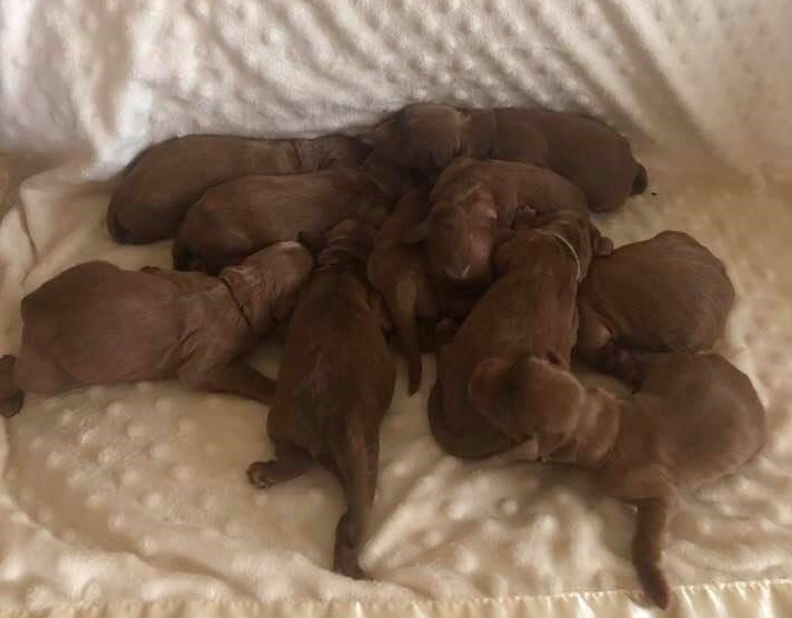 June 12, 2019 – We’re excited to announce that Hazel went into labor around midnight last night and by early this morning, we had ten healthy red and caramel puppies!