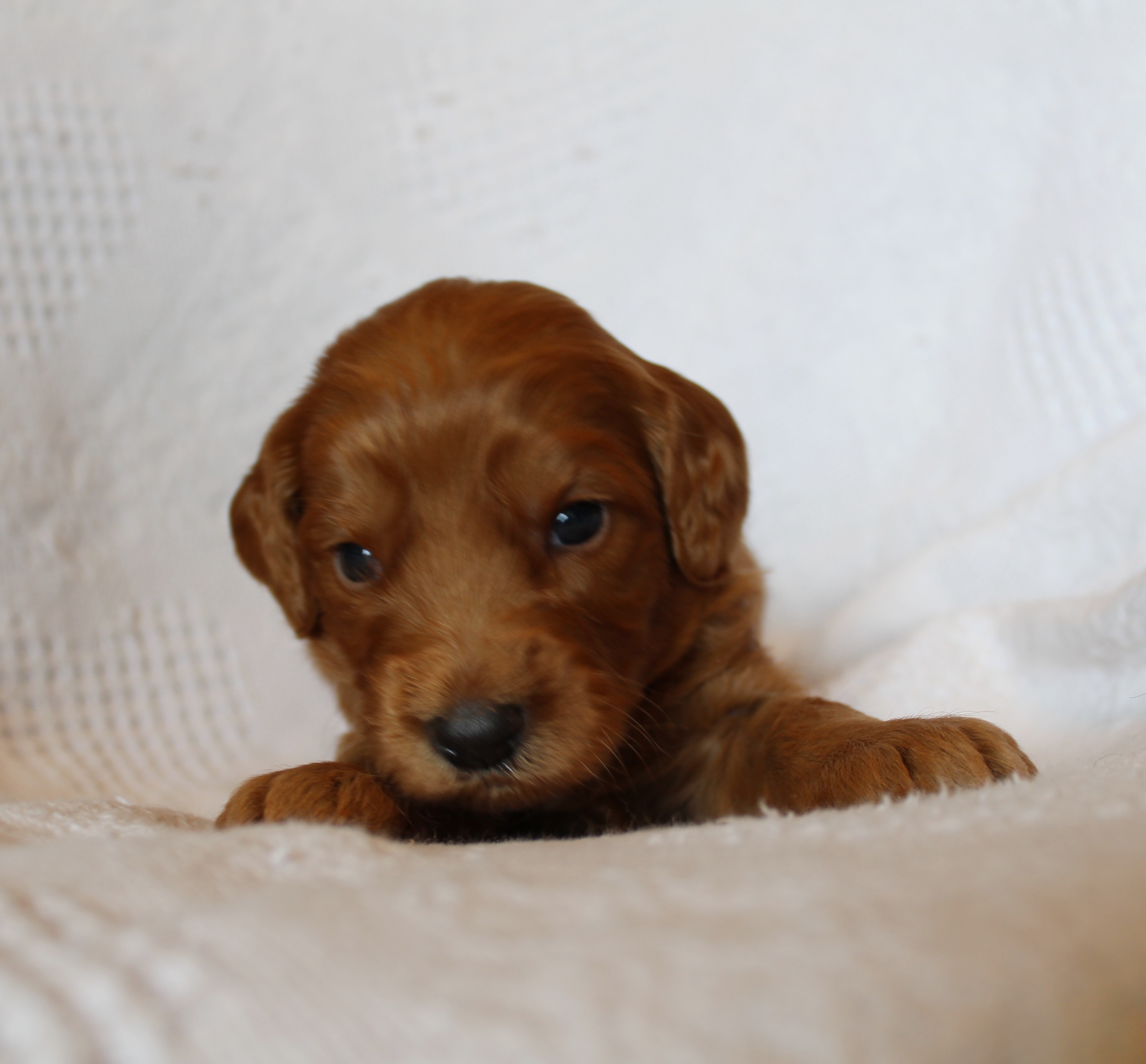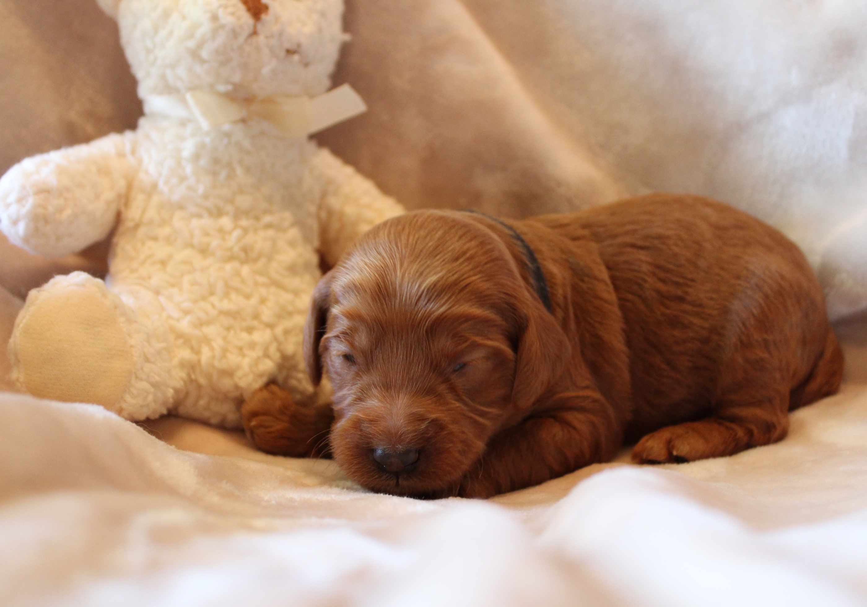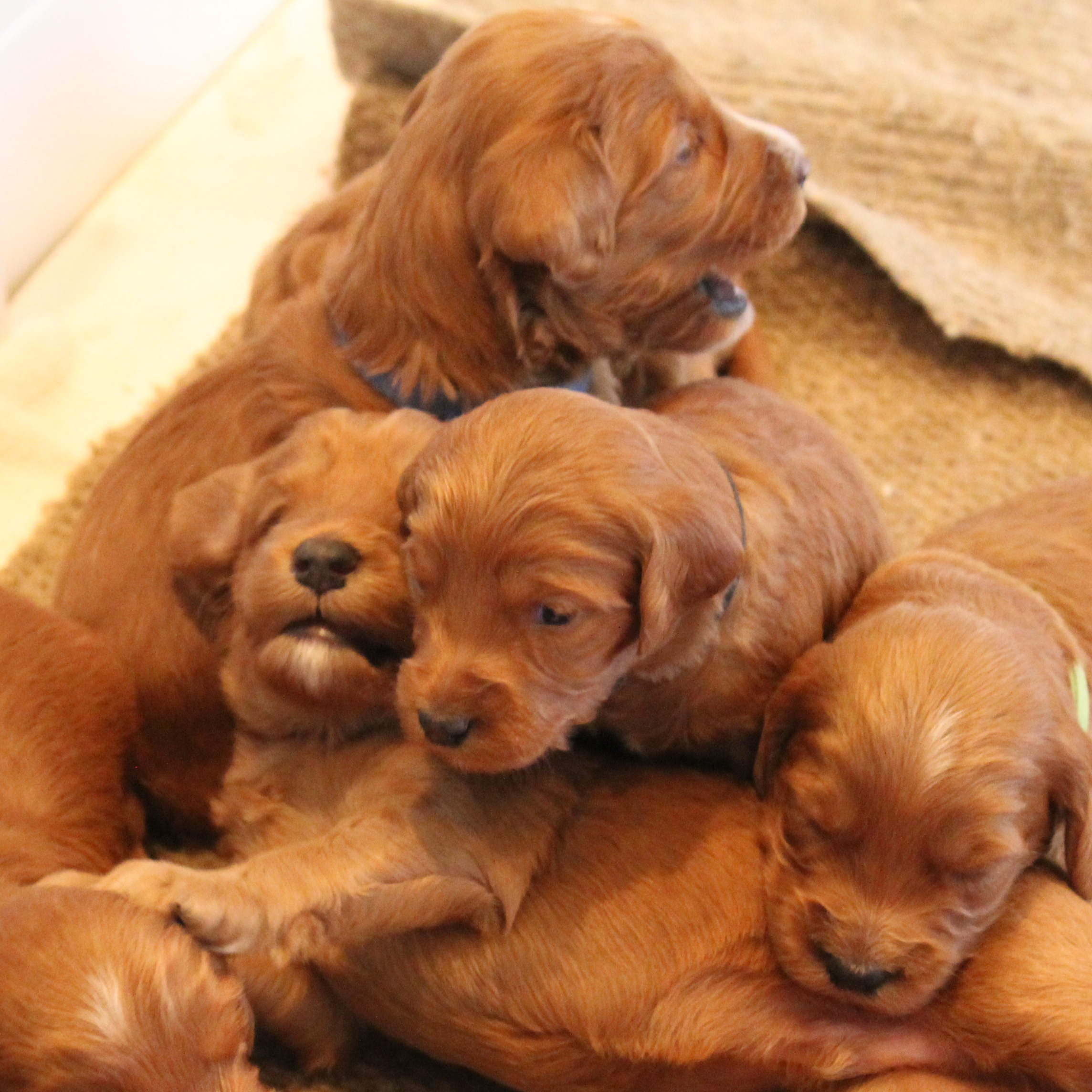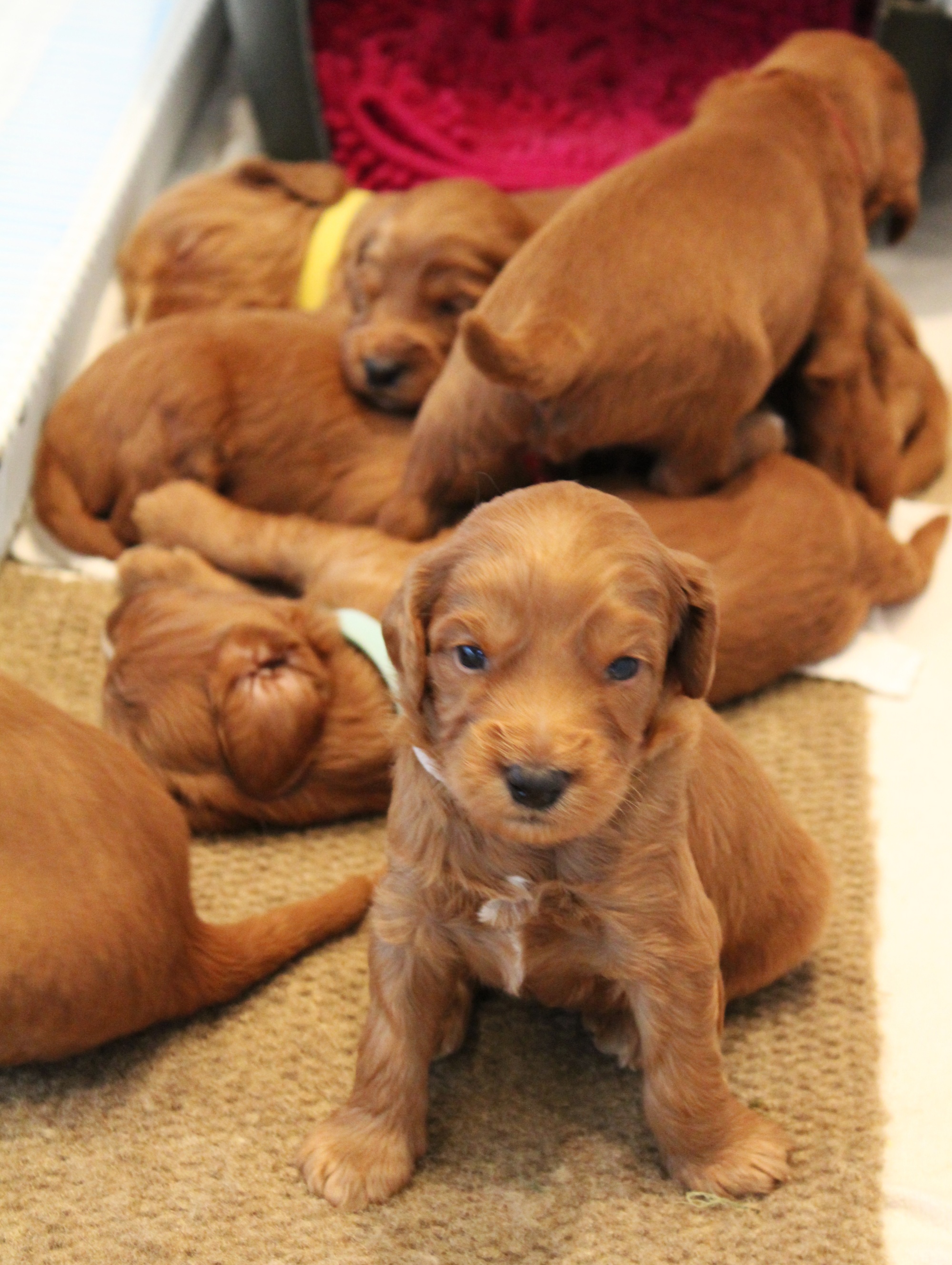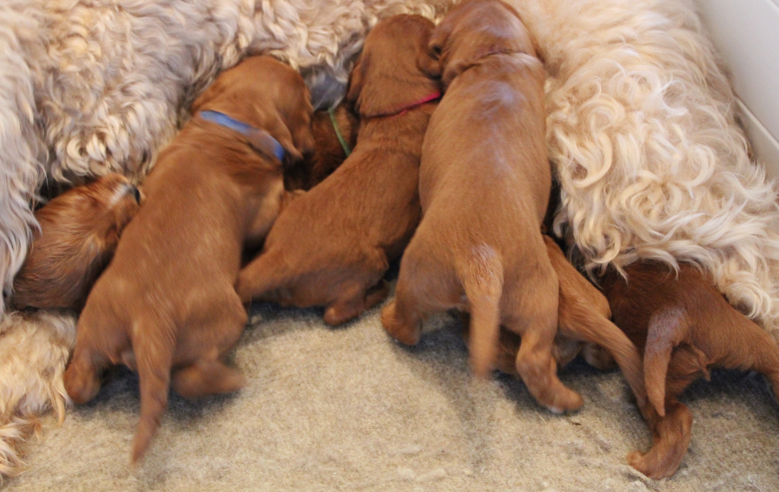June 12, 2019 – We’re excited to announce that Hazel went into labor around midnight last night and by early this morning, we had ten healthy red and caramel puppies!