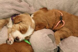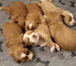 A cute batch of sleeping labradoodle puppies