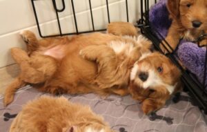 Acting like a typical labradoodle, laying on their backs.
