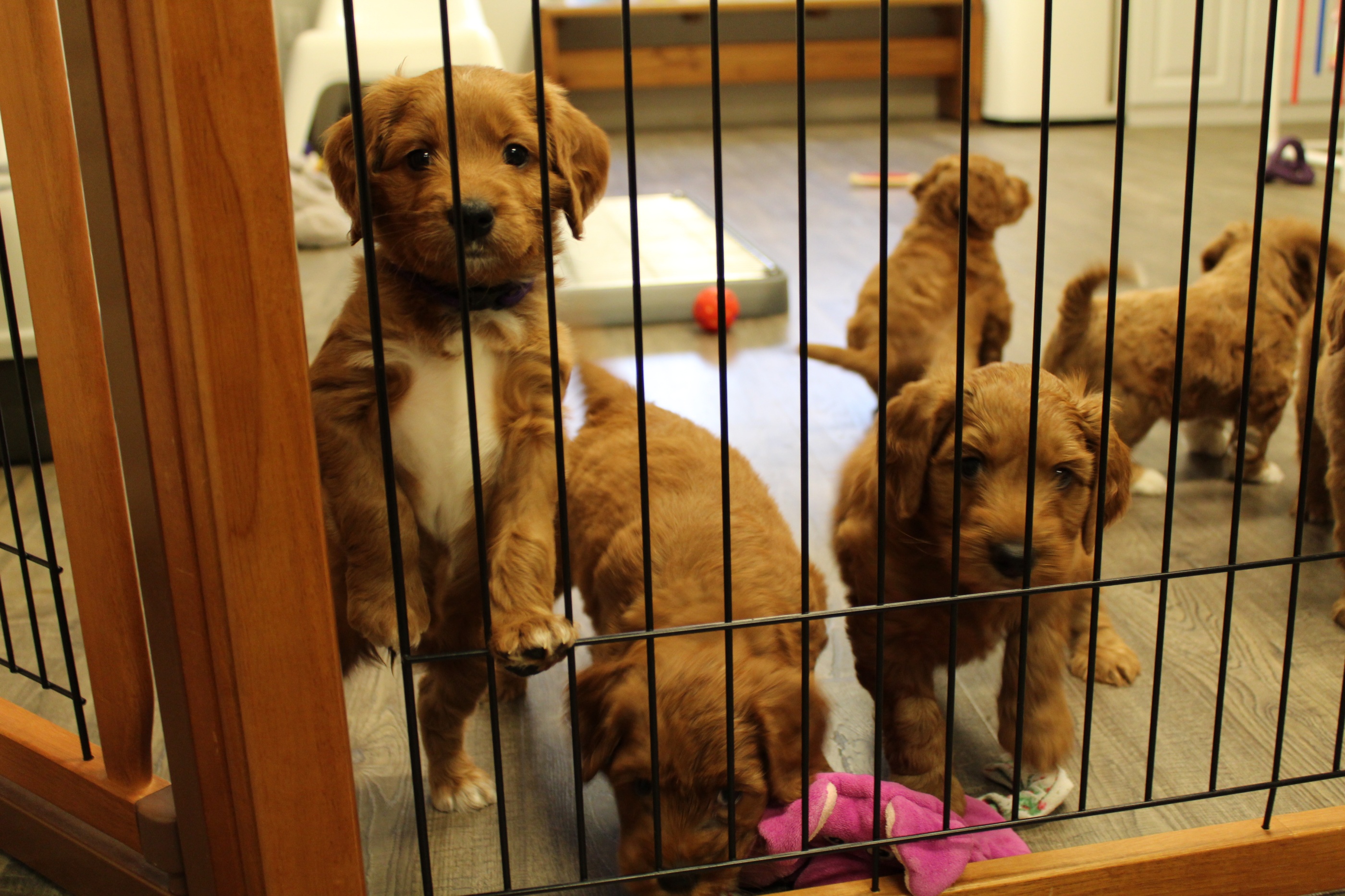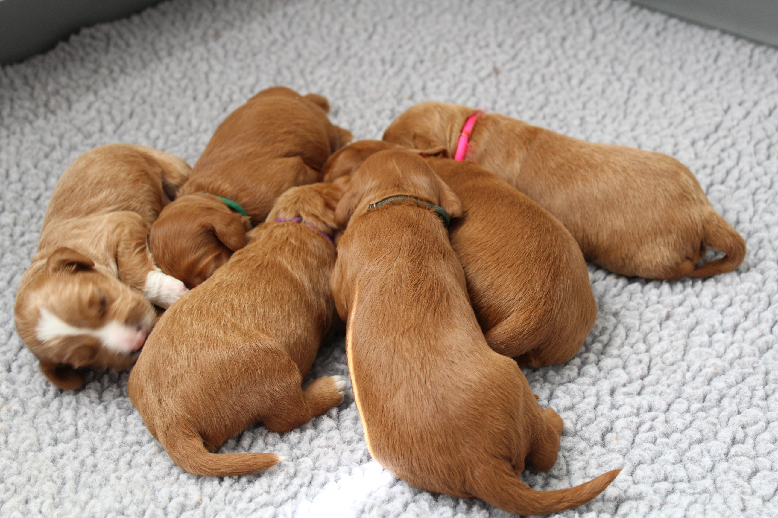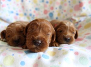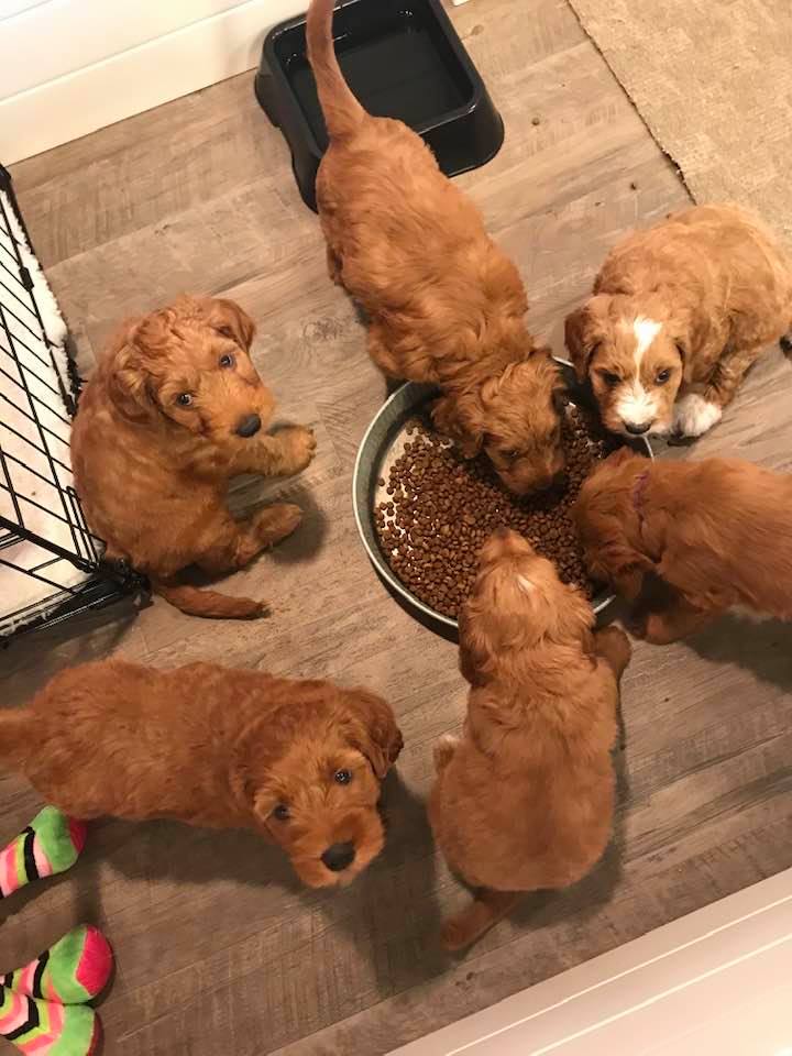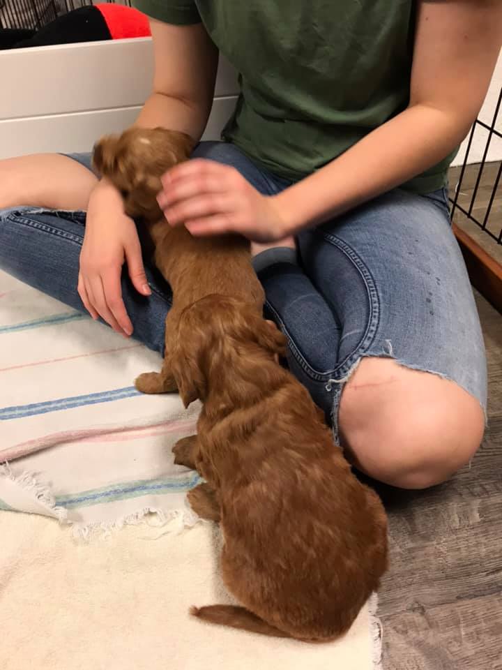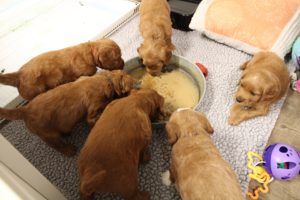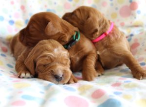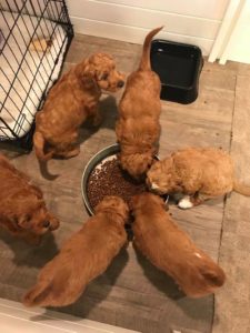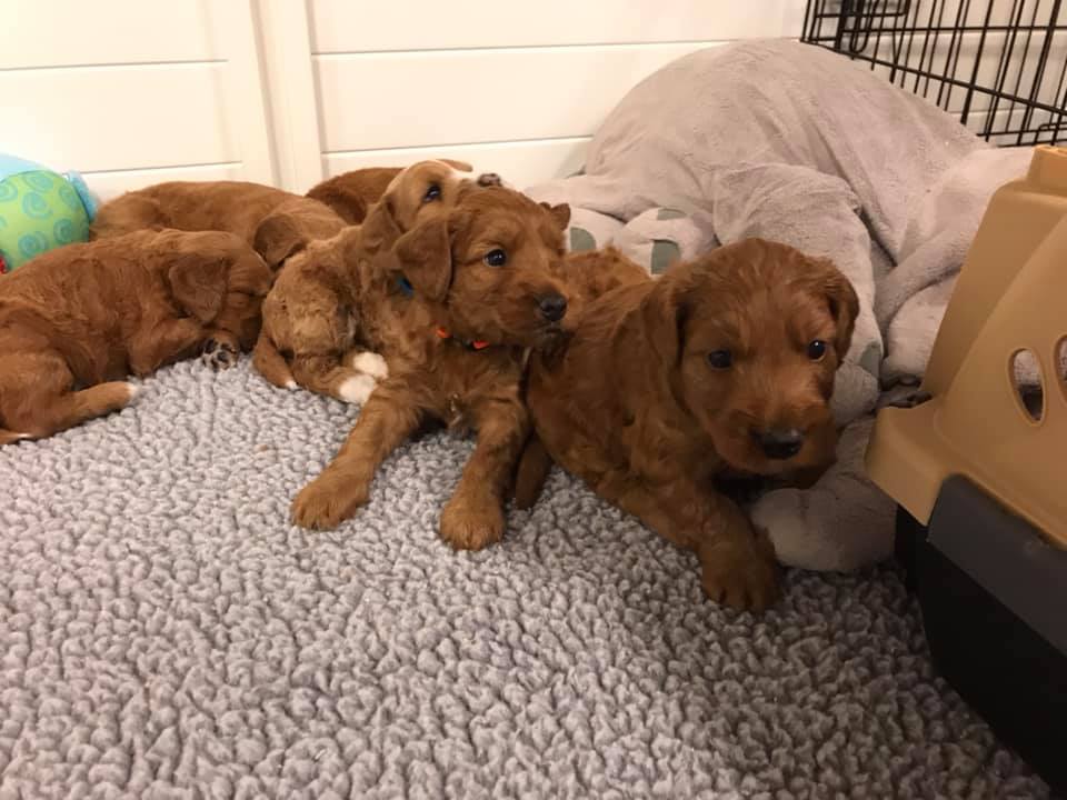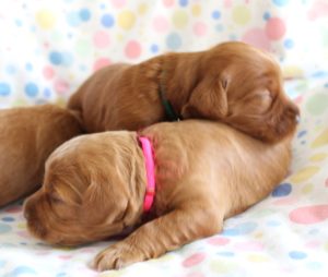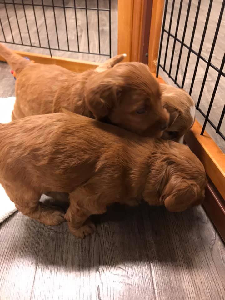 September 6, 2019 – Annie Ruby started labor in the afternoon and by 9 p.m., we had six healthy puppies, nursing and thriving with their mama! We are naming this litter, The Toy Story Litter, and we have three boys and three girls in various red, caramel and apricot coloring, some with white markings.   We welcome to our world Woody, Buzz, Andy, Bonnie, Jessie and Bo Peep!