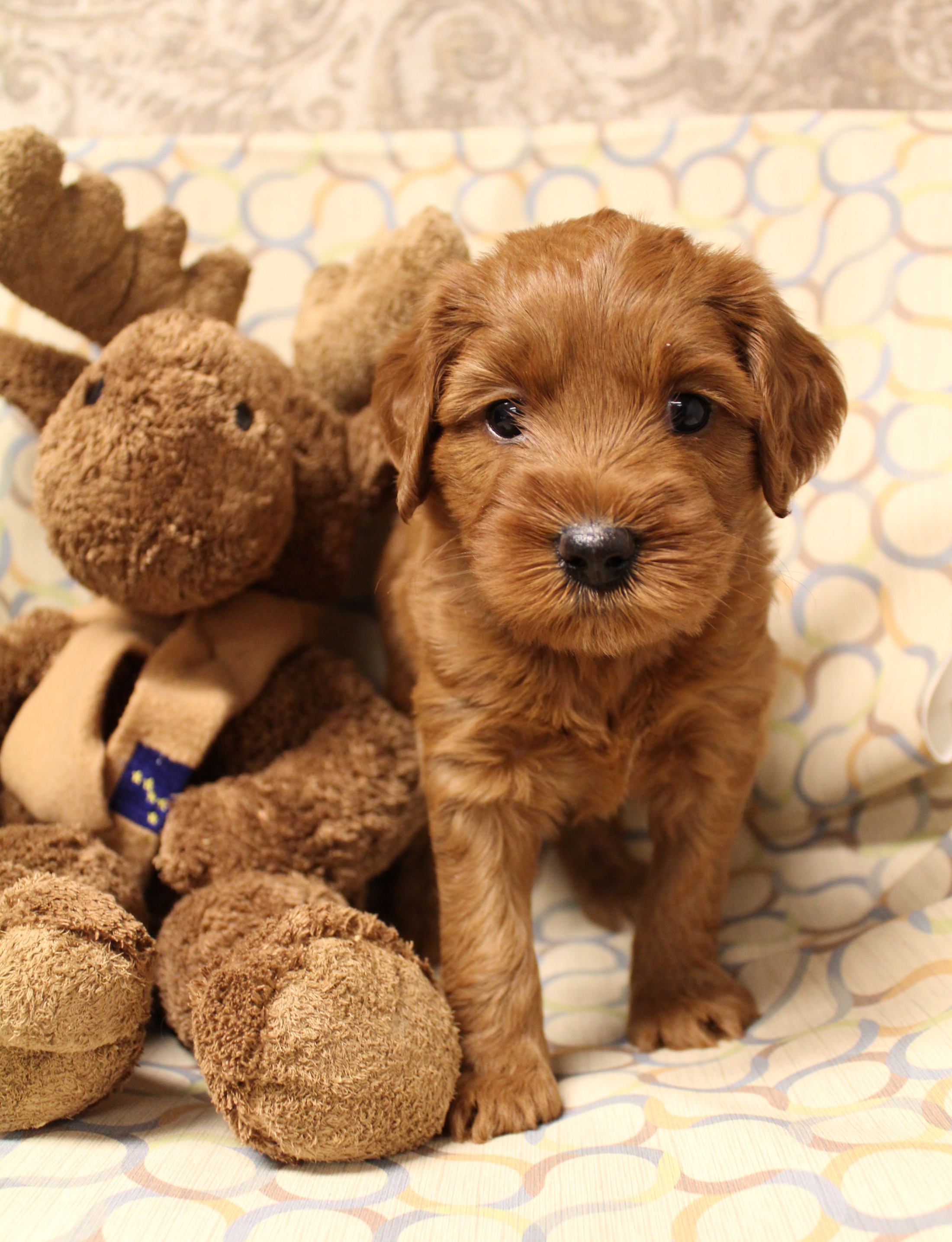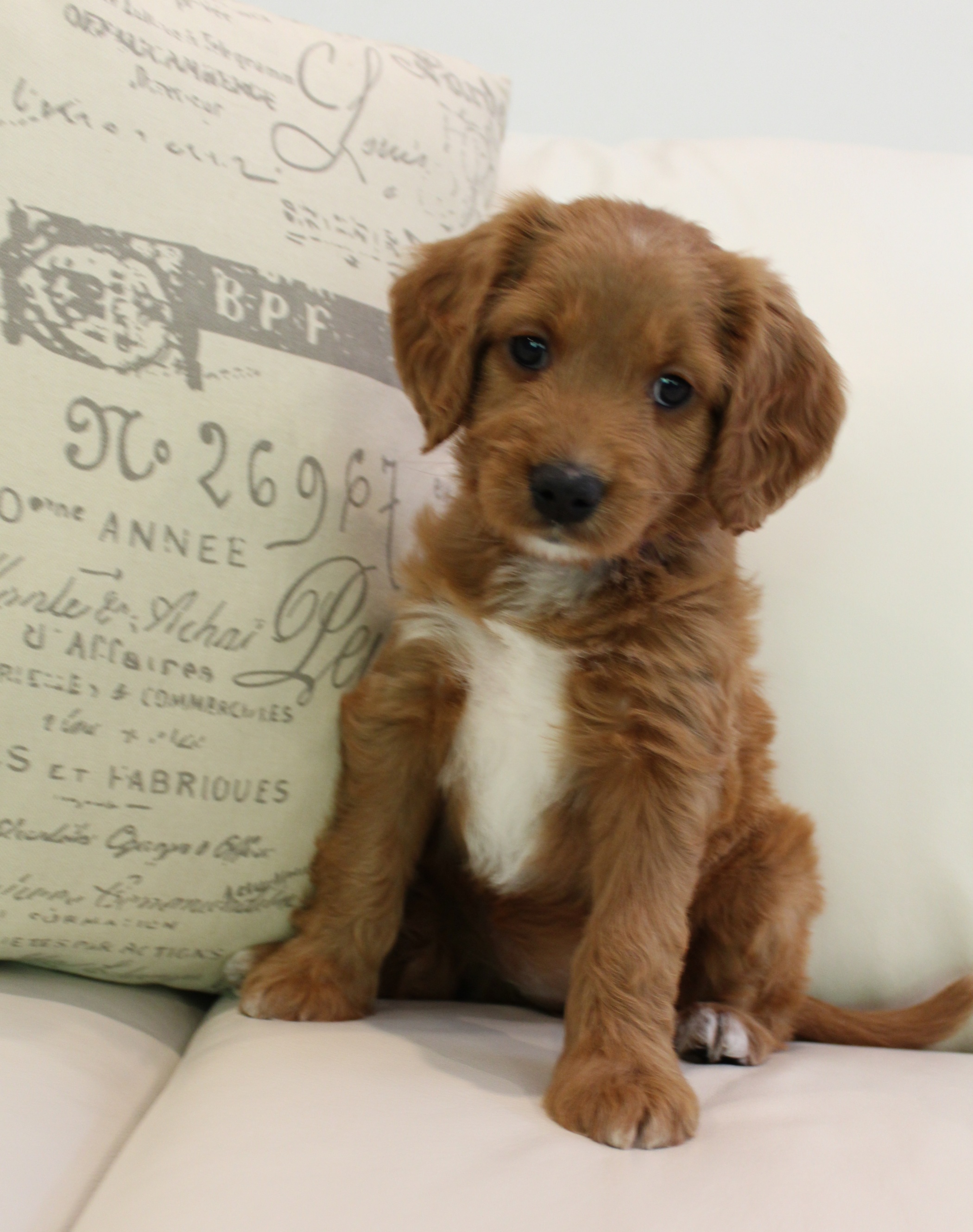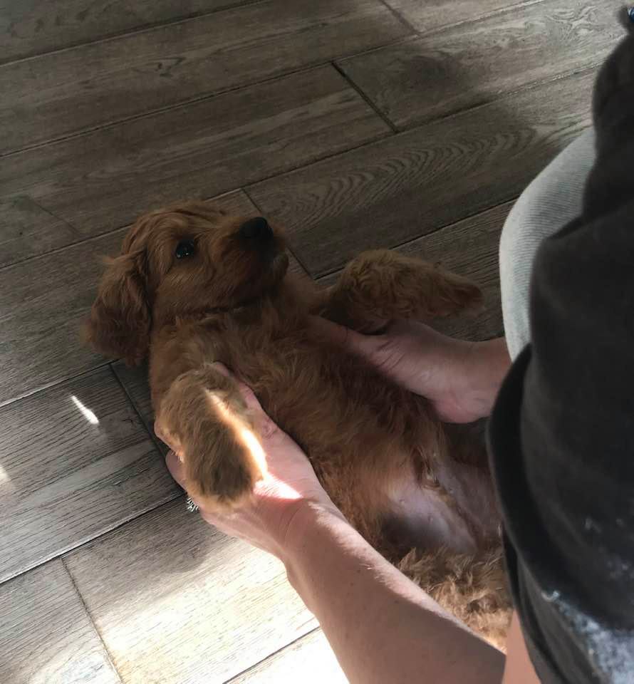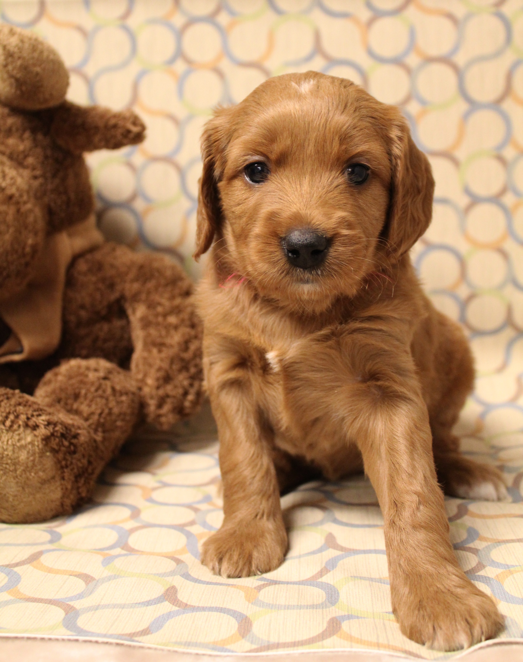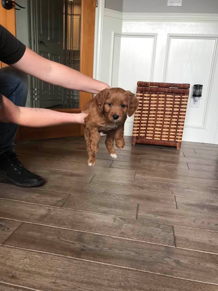 September 6, 2019 – Annie Ruby started labor in the afternoon and by 9 p.m., we had six healthy puppies, nursing and thriving with their mama! We are naming this litter, The Toy Story Litter, and we have three boys and three girls in various red, caramel and apricot coloring, some with white markings.   We welcome to our world Woody, Buzz, Andy, Bonnie, Jessie and Bo Peep!