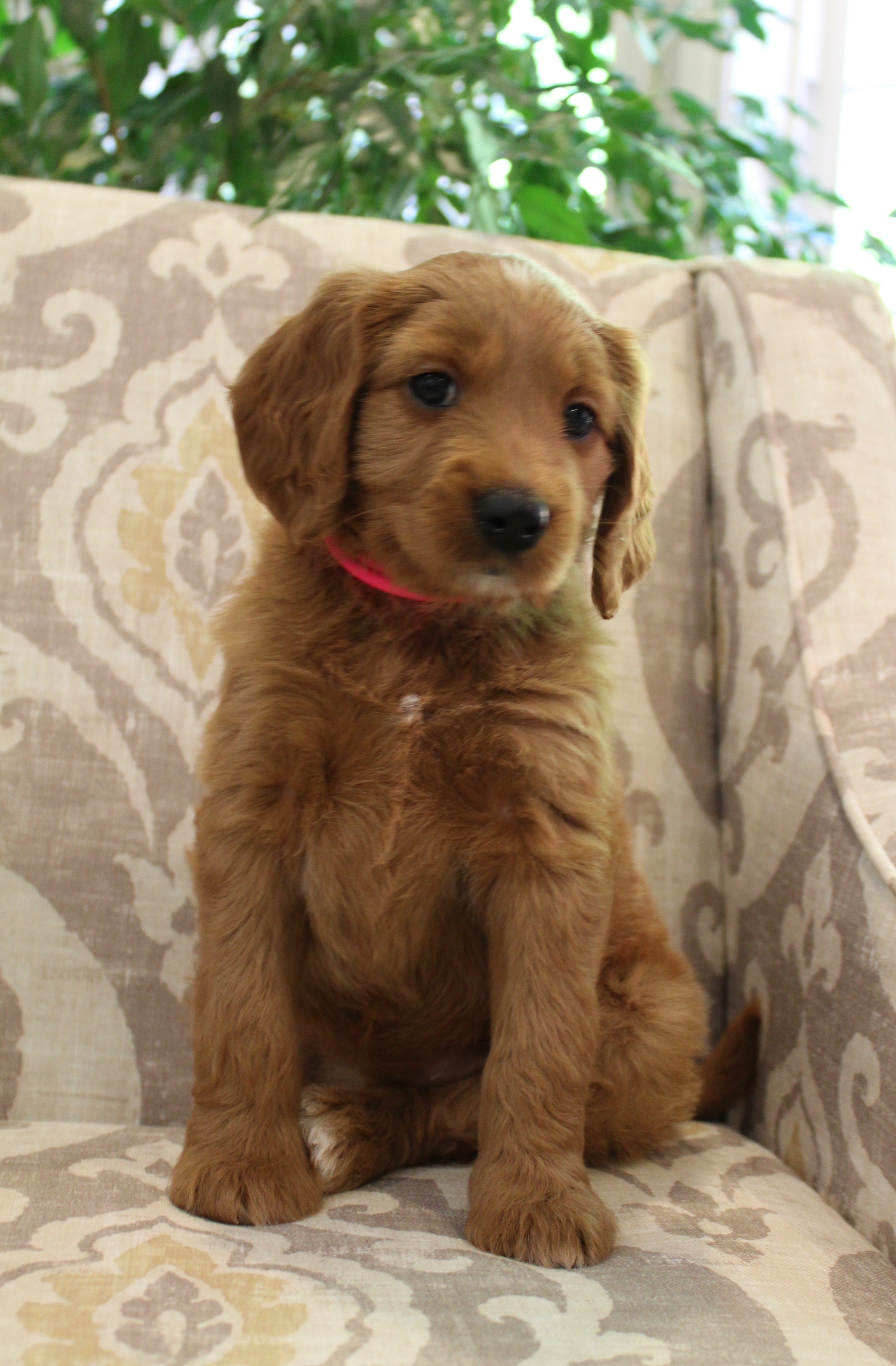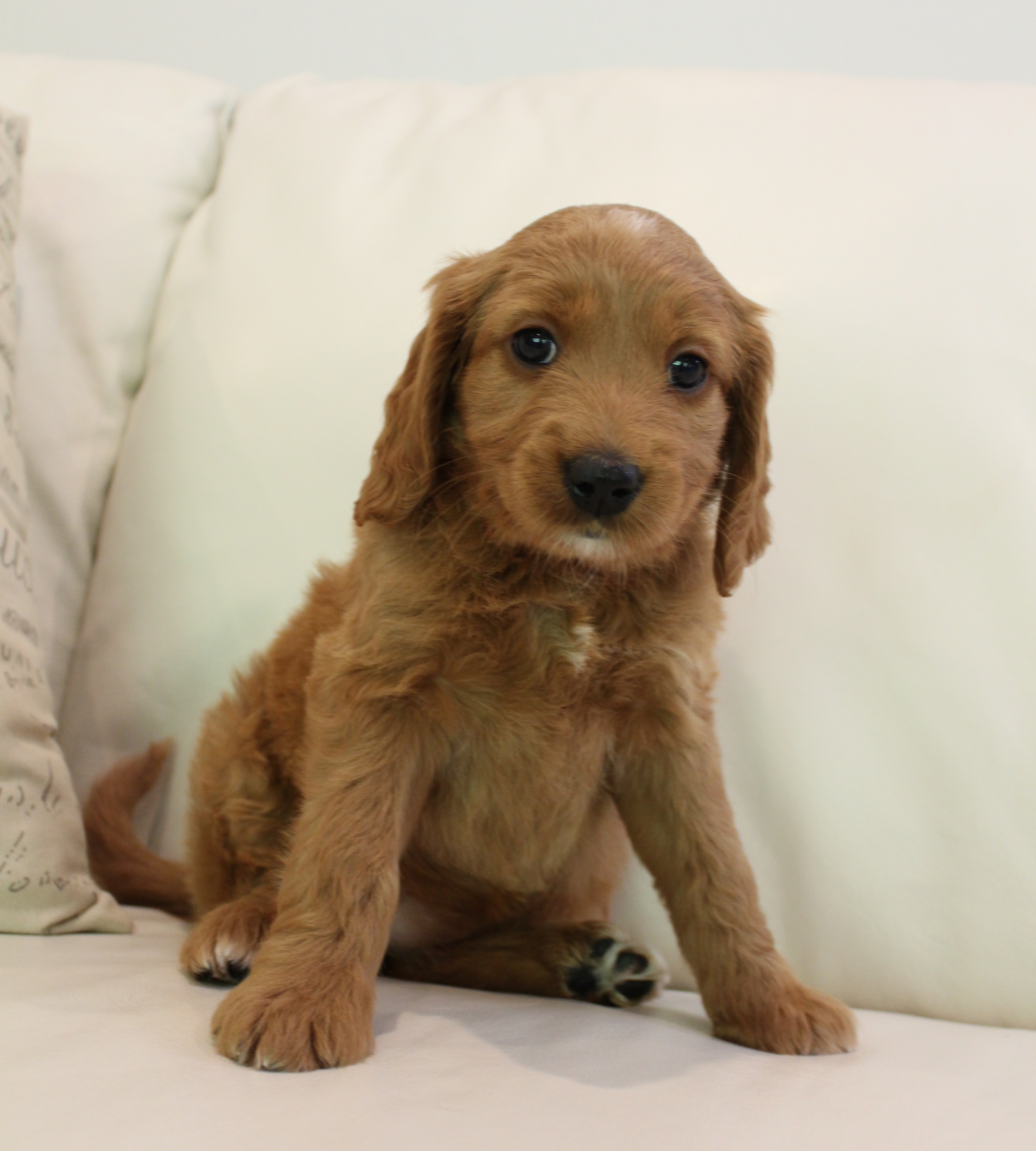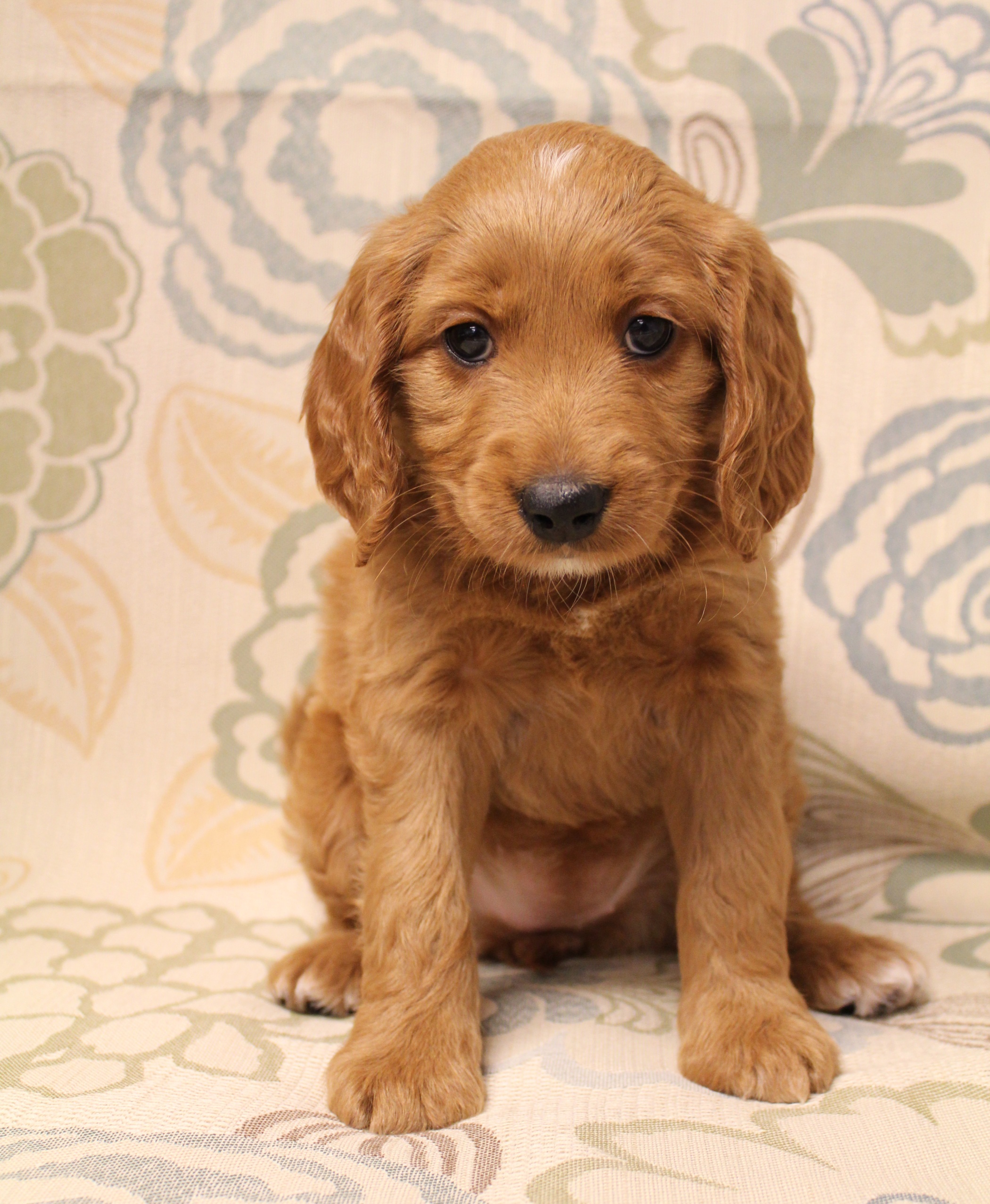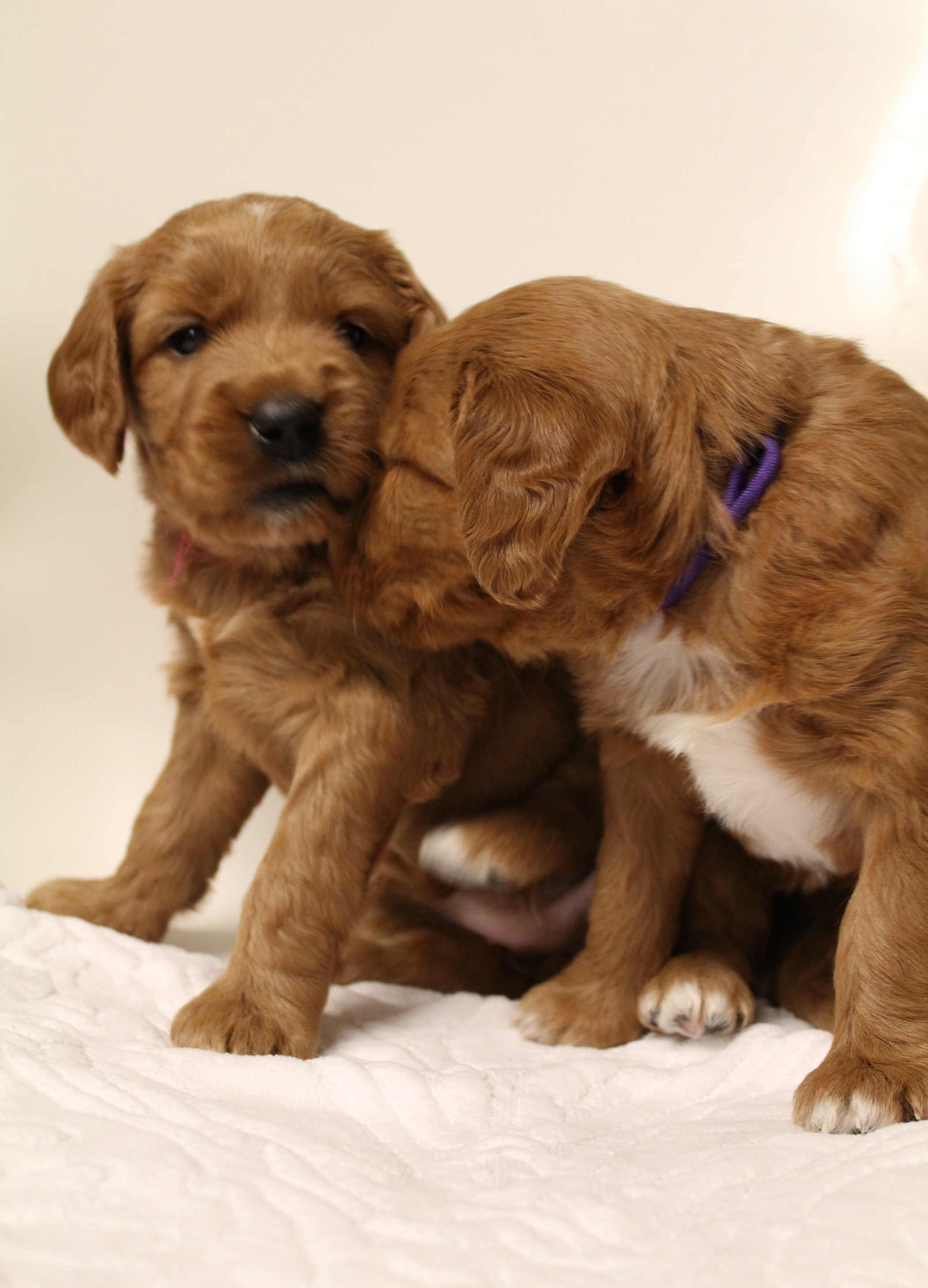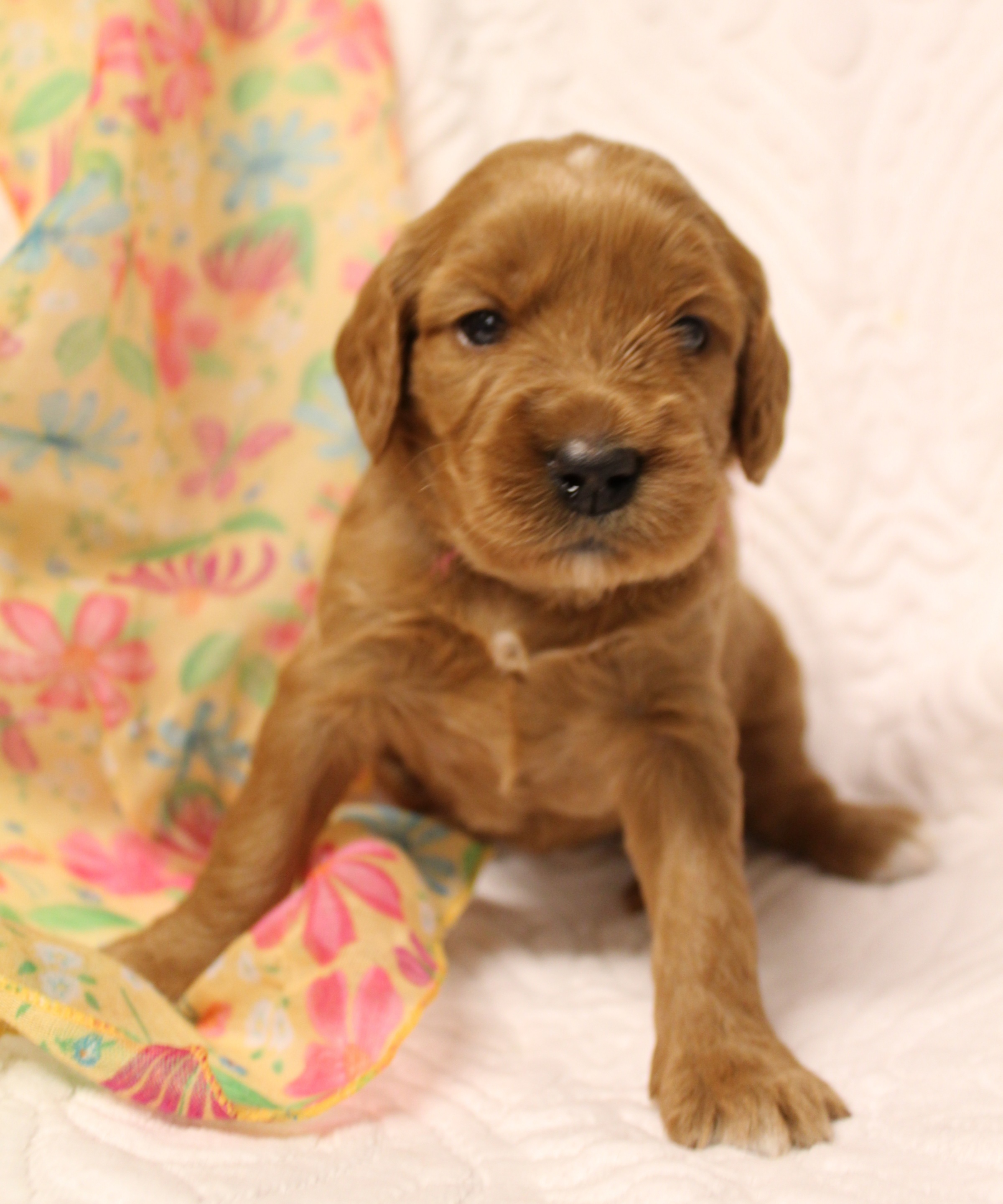 September 6, 2019 – Annie Ruby started labor in the afternoon and by 9 p.m., we had six healthy puppies, nursing and thriving with their mama! We are naming this litter, The Toy Story Litter, and we have three boys and three girls in various red, caramel and apricot coloring, some with white markings.   We welcome to our world Woody, Buzz, Andy, Bonnie, Jessie and Bo Peep!