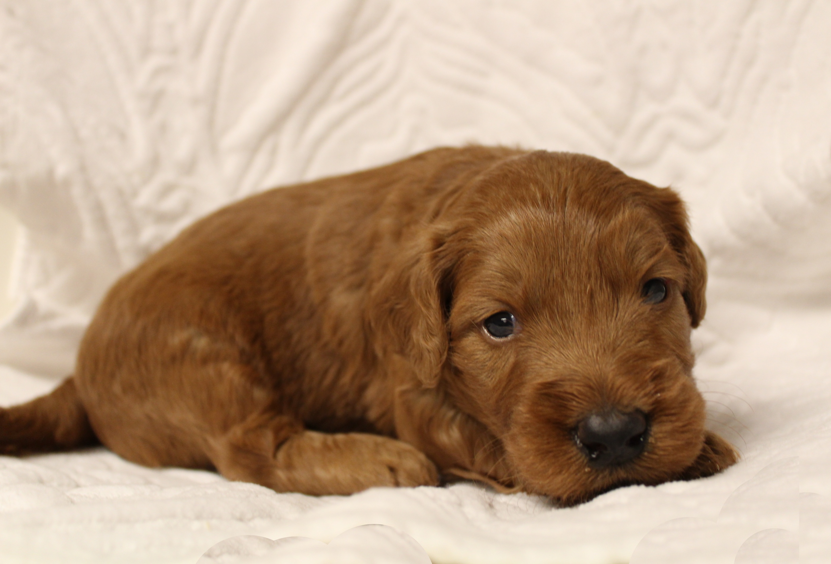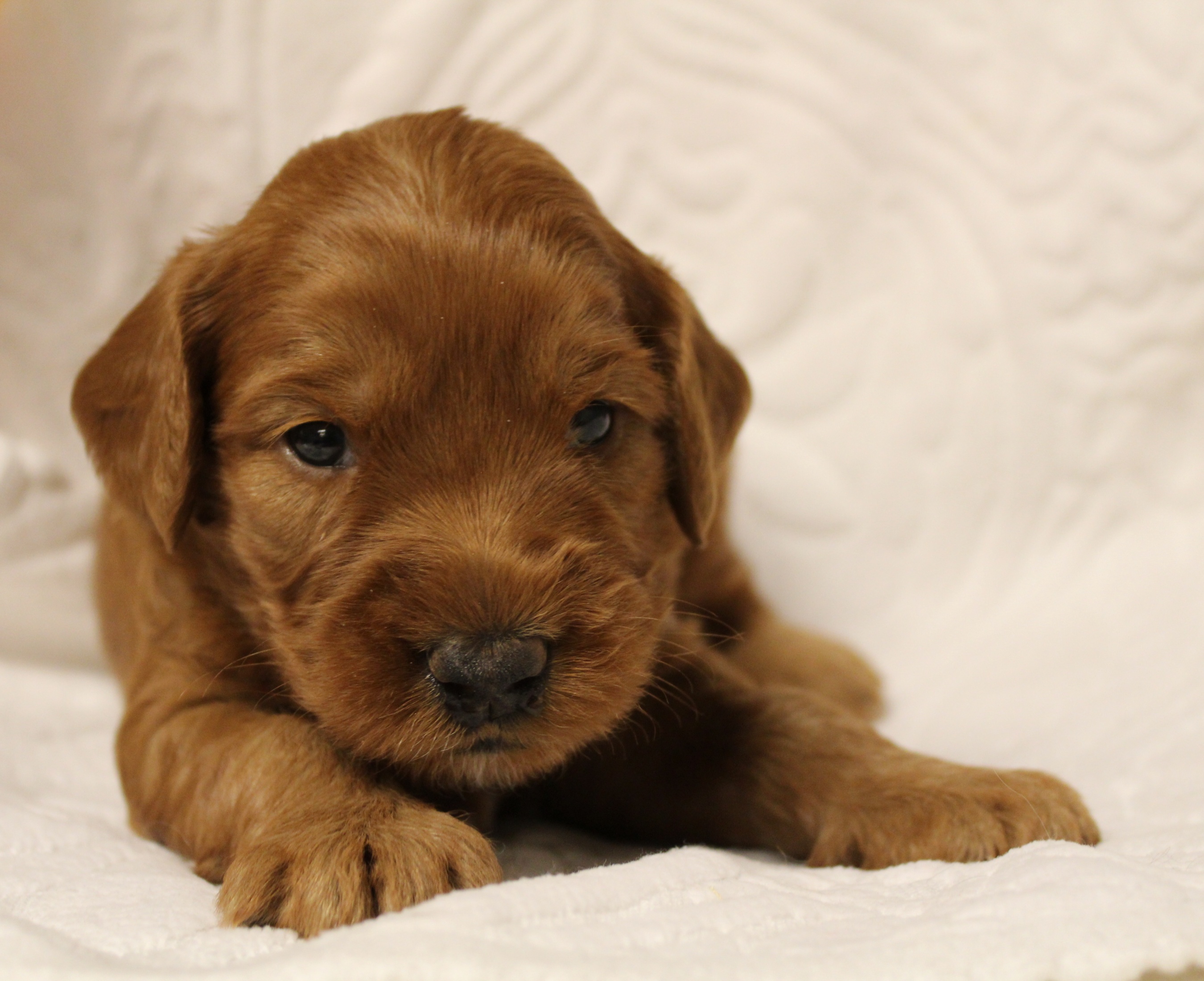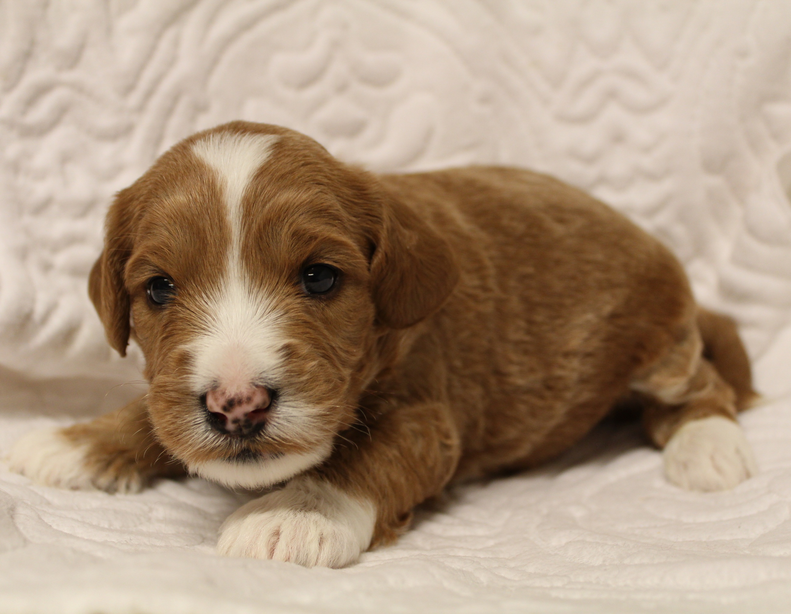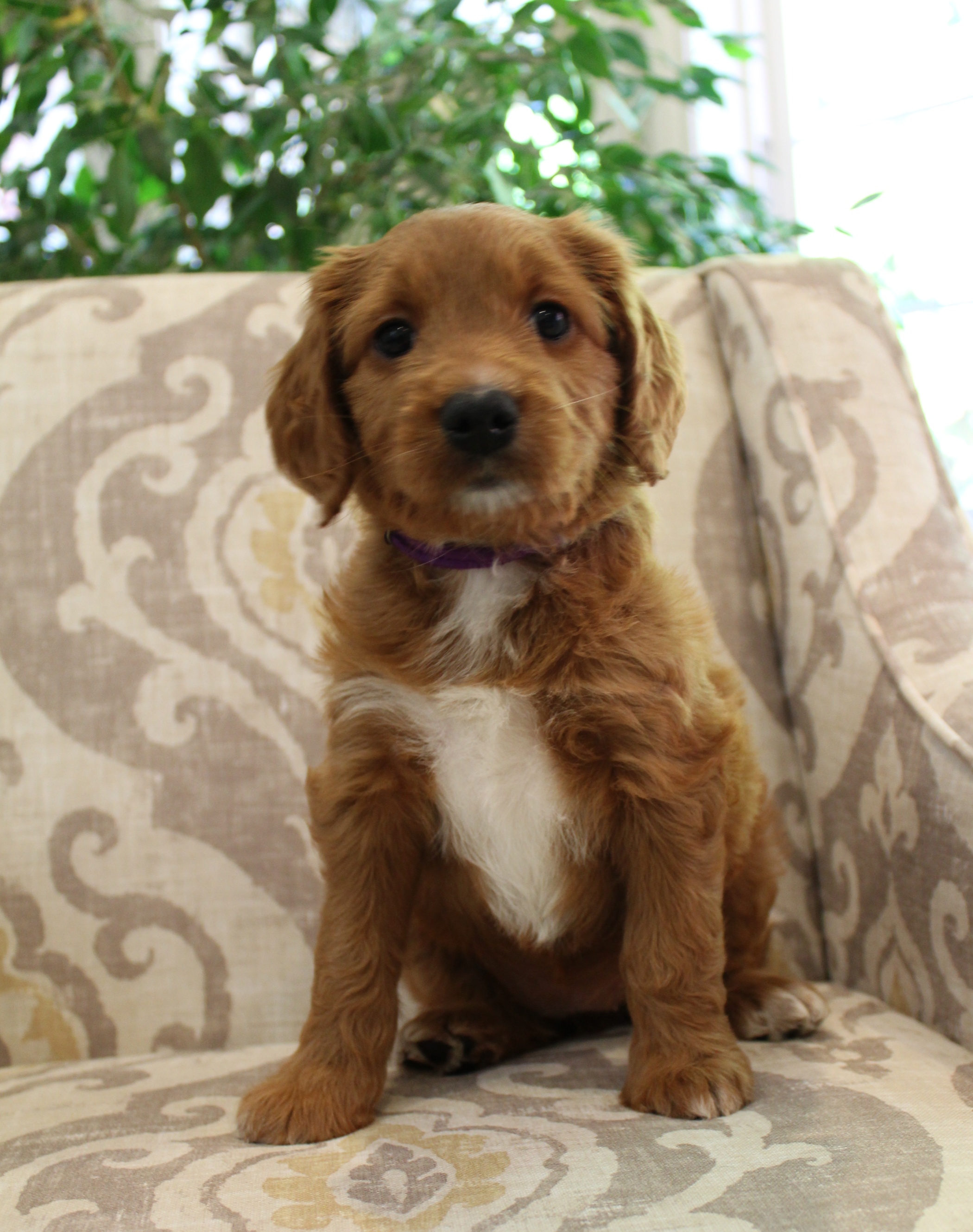 September 6, 2019 – Annie Ruby started labor in the afternoon and by 9 p.m., we had six healthy puppies, nursing and thriving with their mama! We are naming this litter, The Toy Story Litter, and we have three boys and three girls in various red, caramel and apricot coloring, some with white markings.   We welcome to our world Woody, Buzz, Andy, Bonnie, Jessie and Bo Peep!