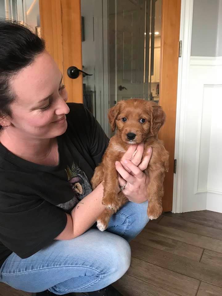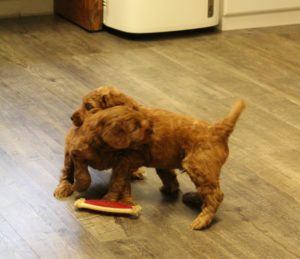 Jessie and Bo Peep seem the most playful and quick to engage with new people, especially kids.They seem fun and slightly more energetic, they will explore and engage with toys and other dogs. Buzz and Woody seem to be the more cautious, less dominant in the group. They are the followers that will sit back and observe a bit before diving in to new experiences at this point. They want to check things out a bit first to see if they’re interested. Andy likes to explore and seems slightly more independent, but as he goes off wandering, he’ll keep looking back to make sure his humans are nearby. Bonnie seems most relaxed at this point. A little harder to read, not sure if it is super chill or not quite as confident as the others yet as she ponders everything and observes quietly. They are all very connected, intelligent, and bond easily with humans – this is in their lab and poodle genetics and reinforced by the way that we have raised them! They all play hard a few times a day, wrestling and chasing to burn off some energy (the puppy zoomies!) and then they settle down quickly to rest or snuggle. They all love to be held and to be close to their humans – this is their favorite thing of all. They are all snugglers!