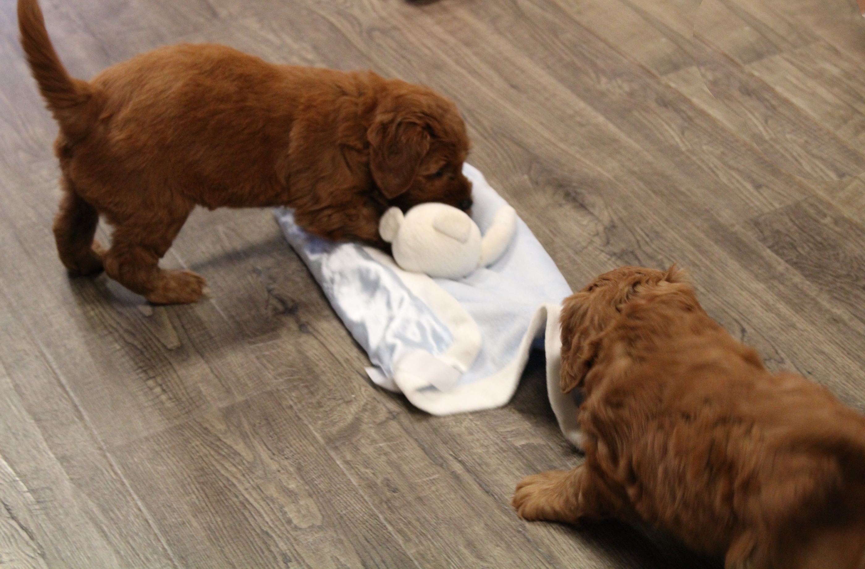 Pups are starting to play with toys.