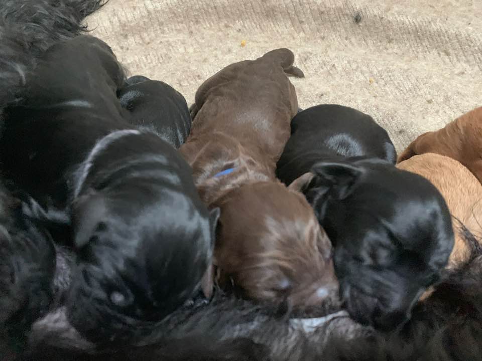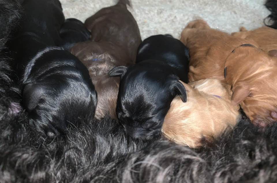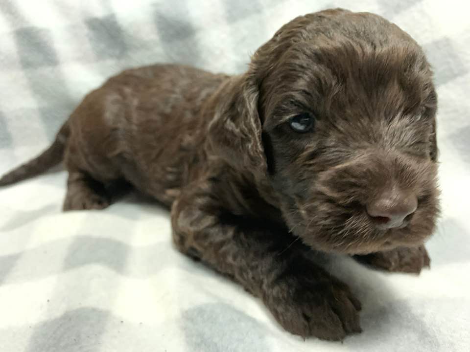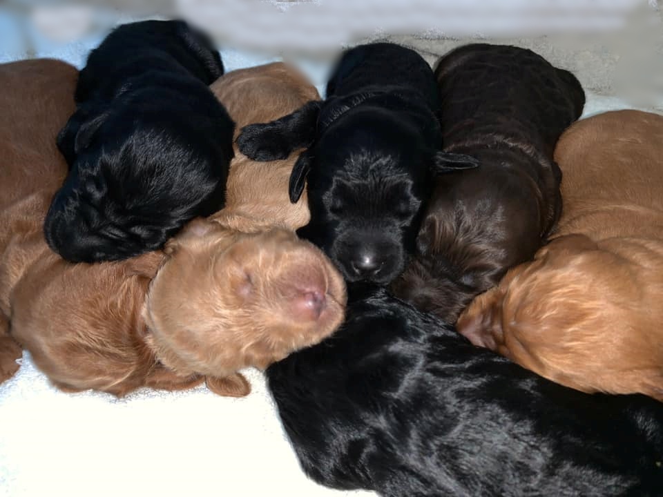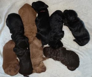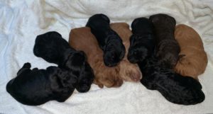 The pictures don’t show much change. But they have gained a lot of weight The pups don’t see or hear yet and mostly just eat and sleep. We’ll start taking individual pictures at three weeks old so you can see who’s who. The dark chocolate pup is a boy and the only girl in the bunch is one of the red-apricot pups. We’ve themed this litter our NFL litter and we’re excited to welcome Bengal (girl), Chief, Packer, Colt, Charger, Steeler, Raider, Bronco, and Raven. Here they are at one week old!