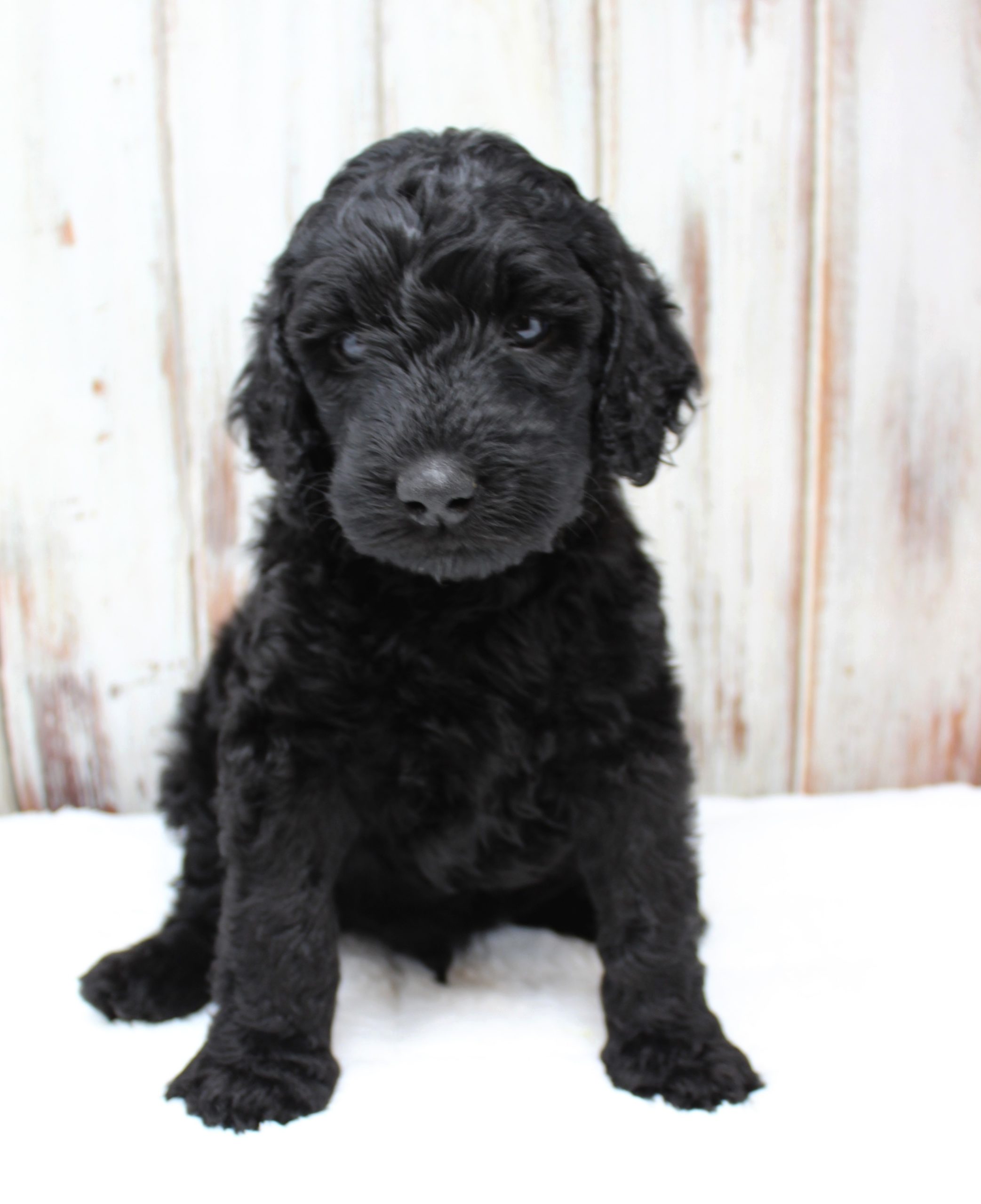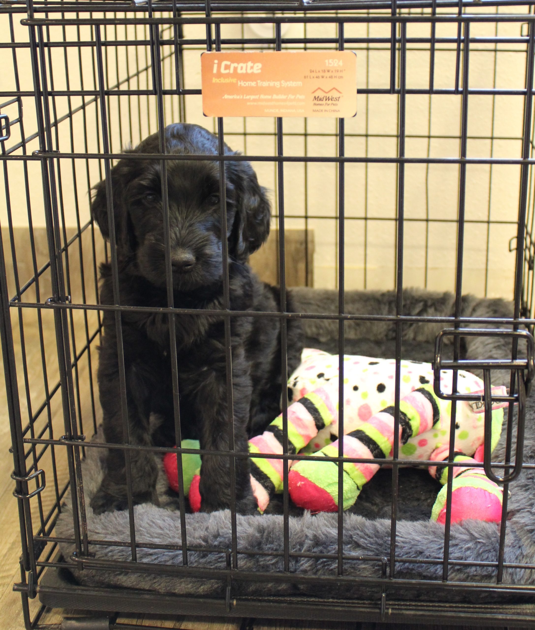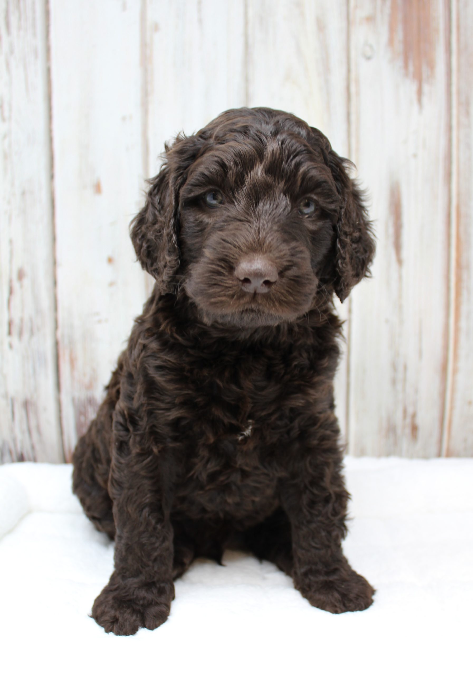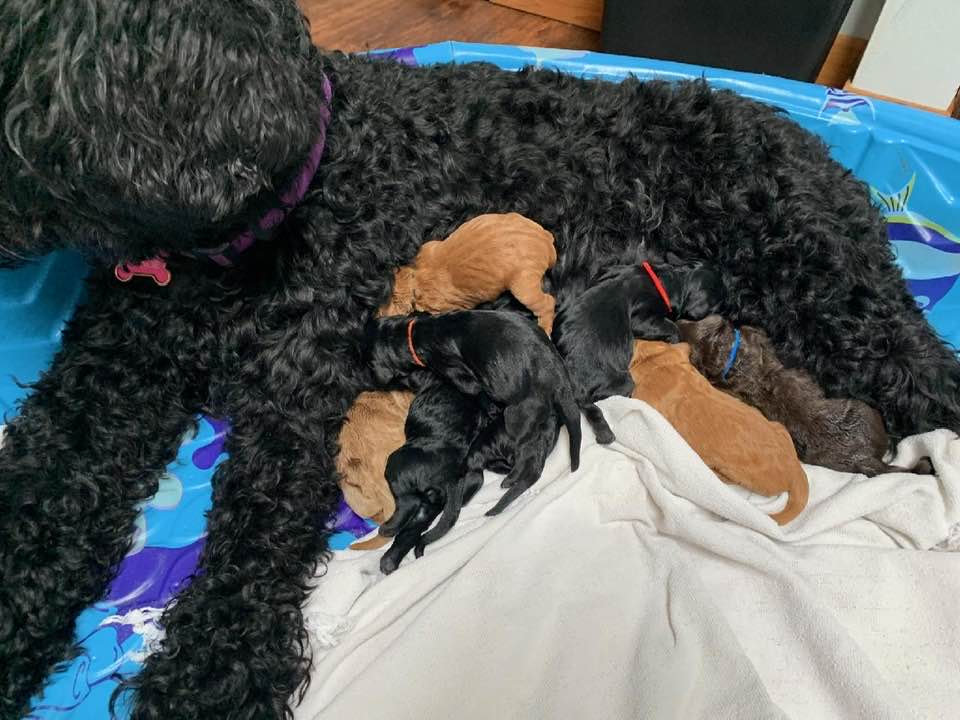 April 7, 2020 – Gracie’s puppies are over four weeks old now. And we’re excited to post these pictures. They are seriously cute!! Their coats are filling in so thick already at this young age. Some of them our getting their wavy curls now. They are eating a LOT, and mama Gracie has backed off quite a bit because they have nails and teeth. She is always walking over to the pen to check on them to make sure all is well, but she really doesn’t like going into the pen to lay with them anymore. I think she feels trampled now when she gets too close to her litter.
