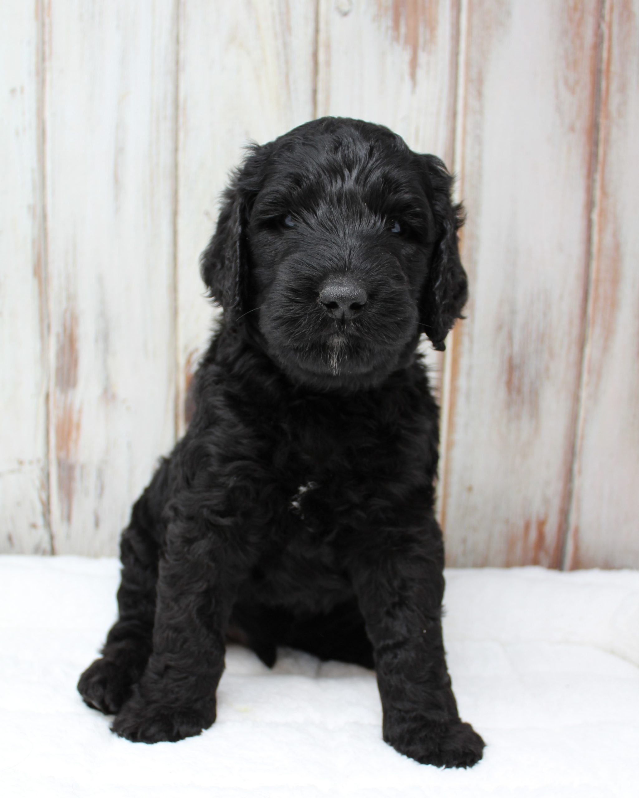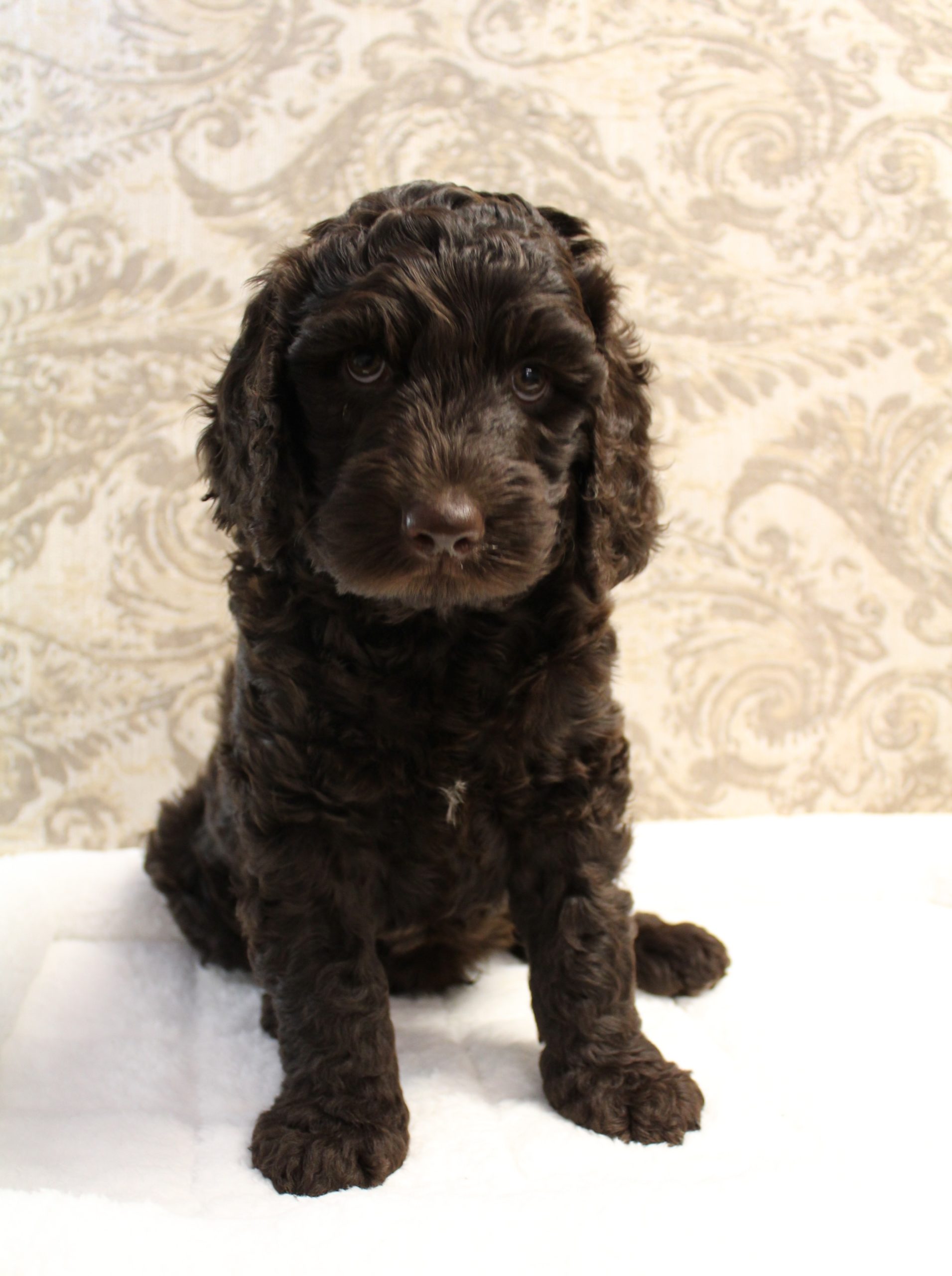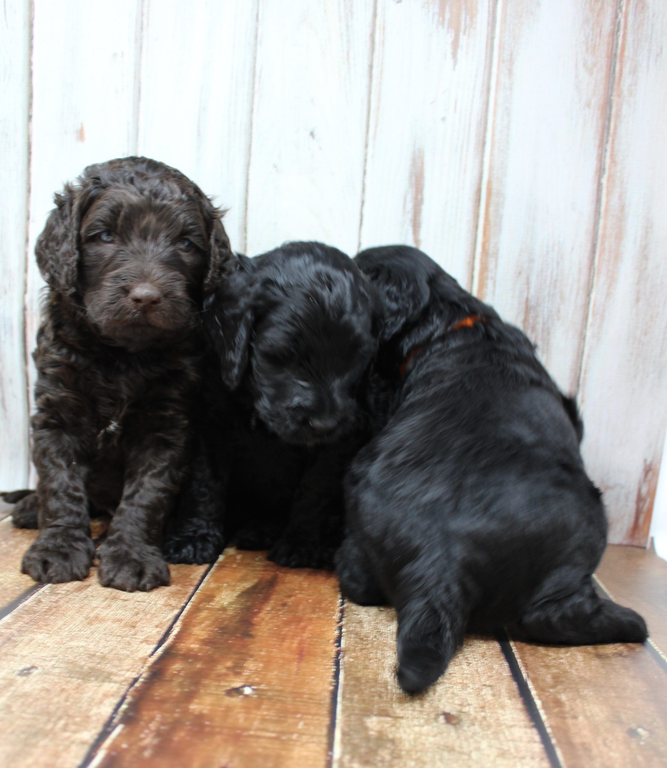 April 7, 2020 – Gracie’s puppies are over four weeks old now. And we’re excited to post these pictures. They are seriously cute!! Their coats are filling in so thick already at this young age. Some of them our getting their wavy curls now. They are eating a LOT, and mama Gracie has backed off quite a bit because they have nails and teeth. She is always walking over to the pen to check on them to make sure all is well, but she really doesn’t like going into the pen to lay with them anymore. I think she feels trampled now when she gets too close to her litter.