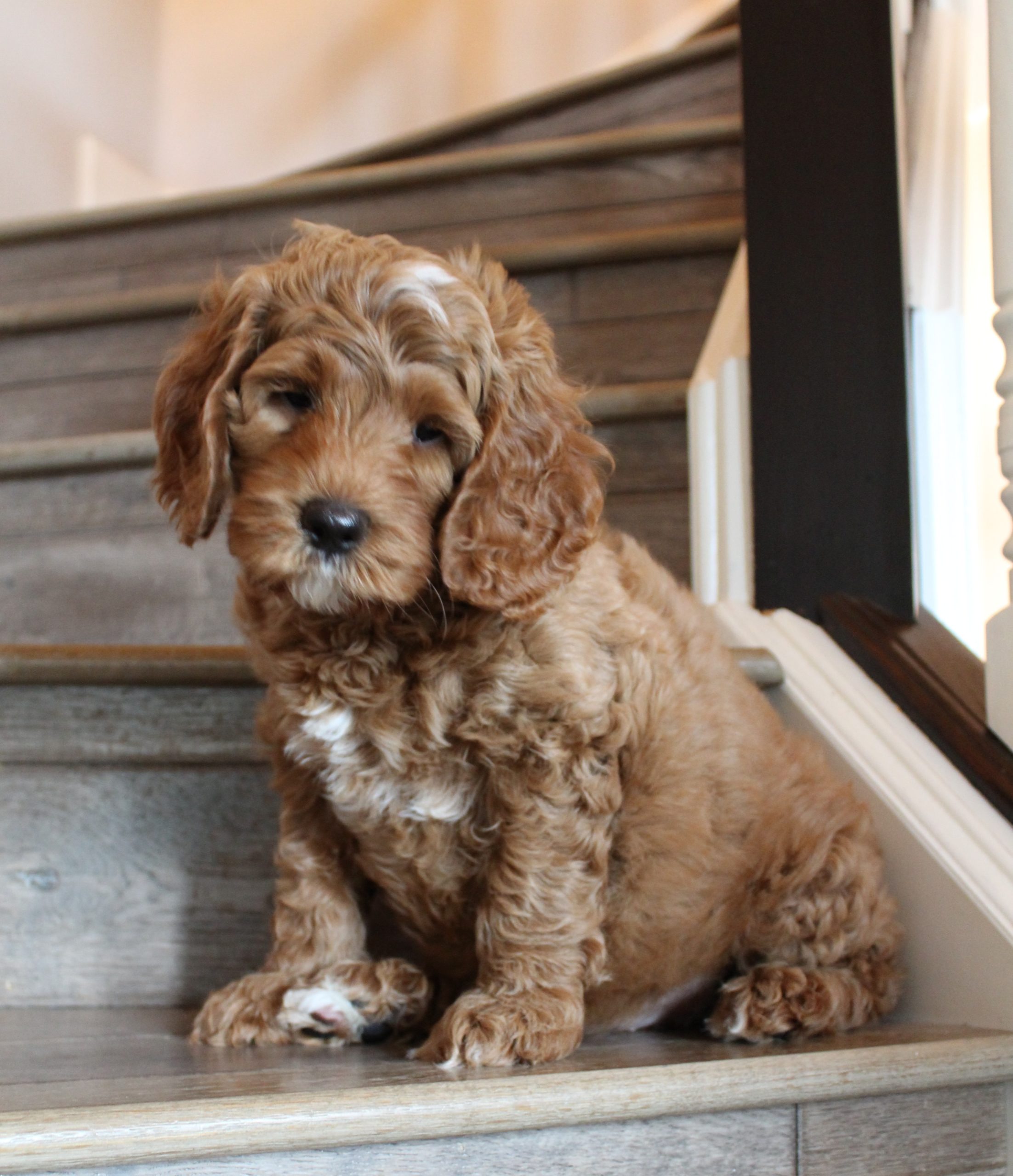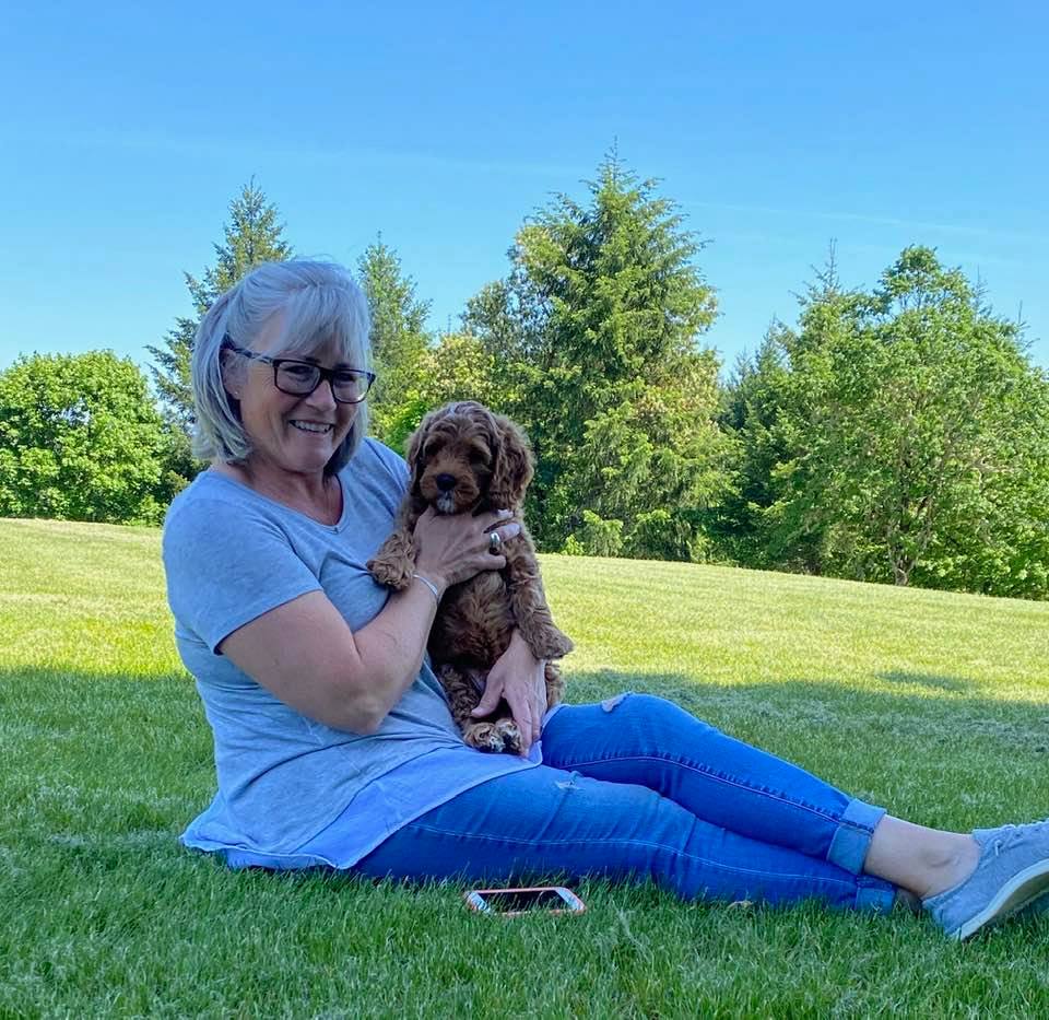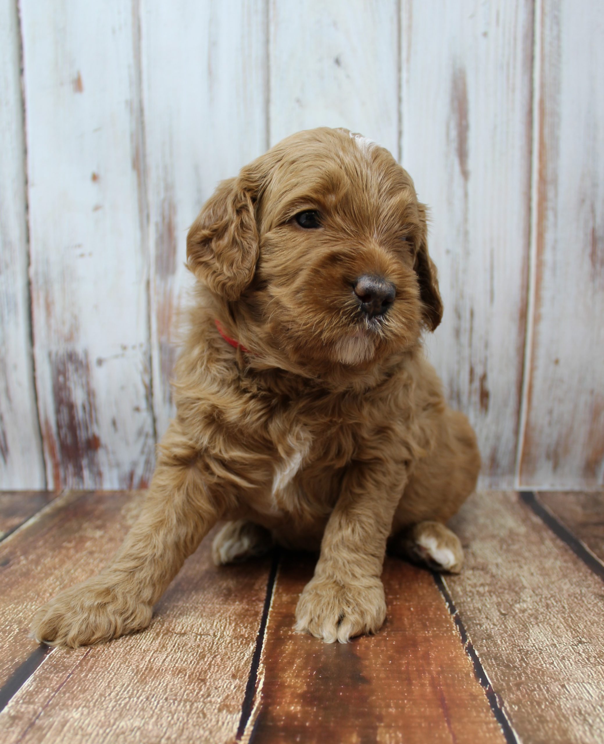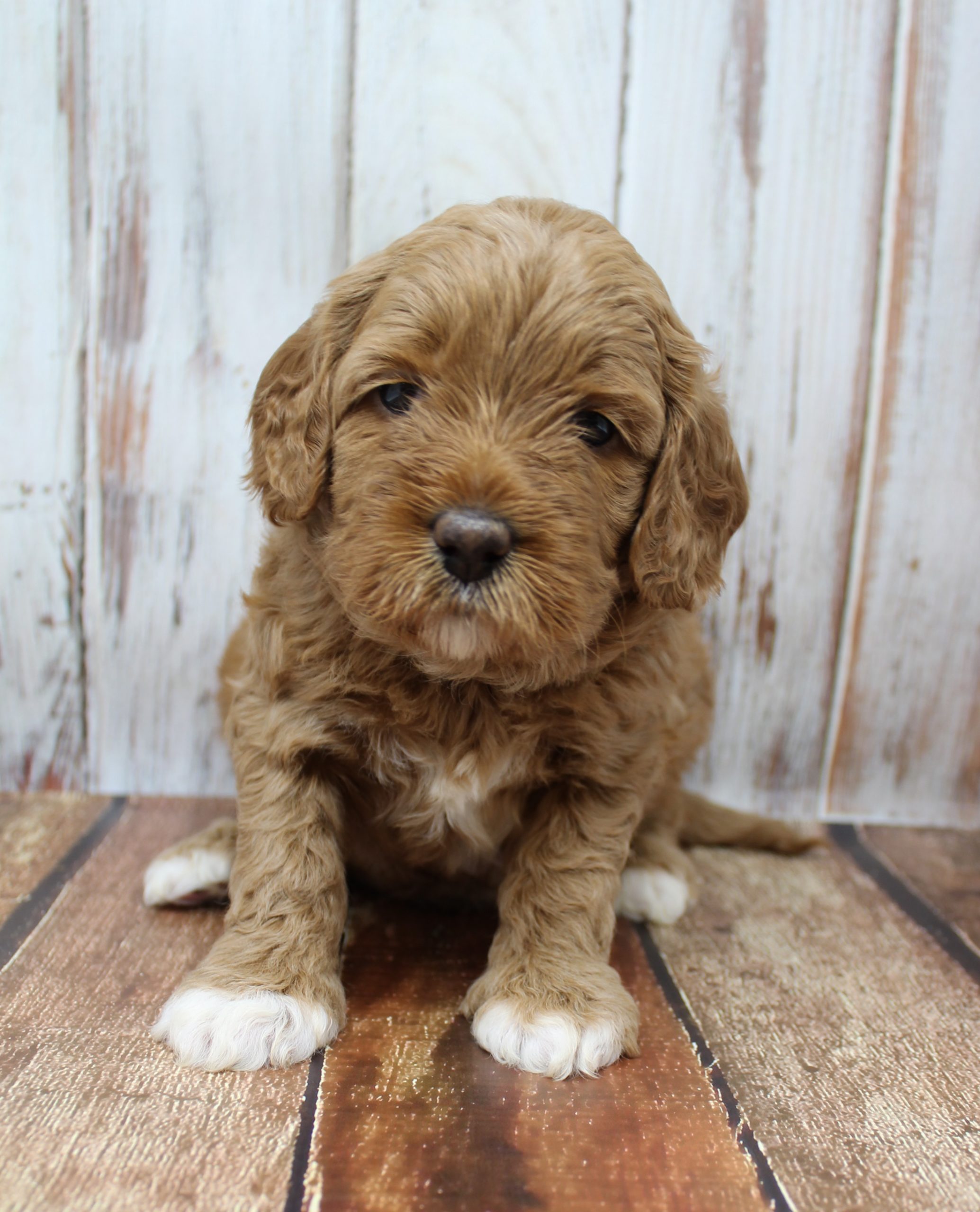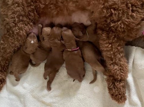 April 21, 2020 – Gretel and Barkley’s puppies are five weeks old, eating kibble and litter box trained (mostly.) They have teeth, so mama is definitely backing off of nursing and hanging out with them. She stays close by, but they’re learning to become more independent. Gary and Gretchen are the biggest and probably going to be dad’s size (almost 40 lbs.). Gus is smaller than any of the others (probably be around 30 lbs.) and the others are in between. We took new pictures yesterday!