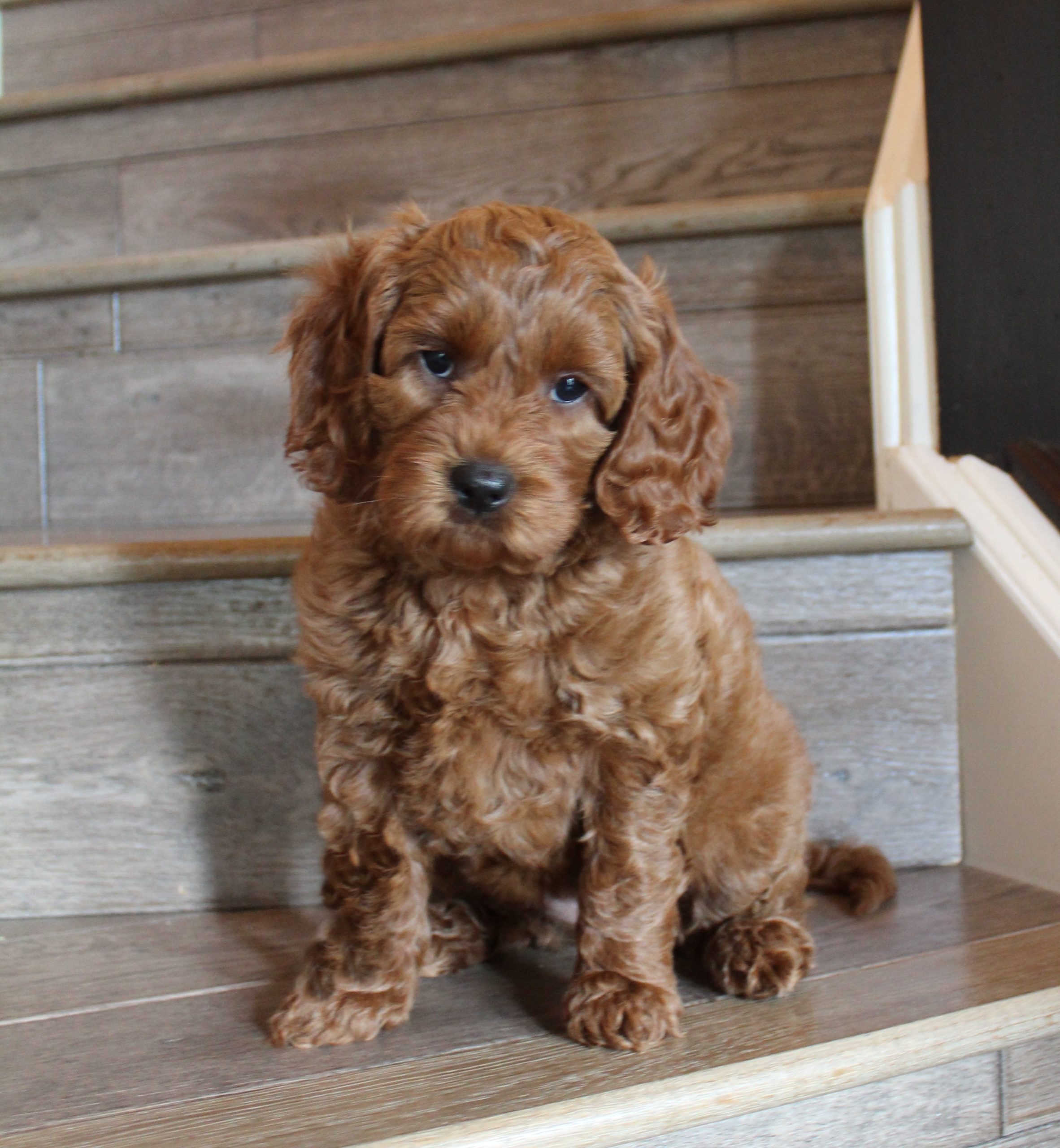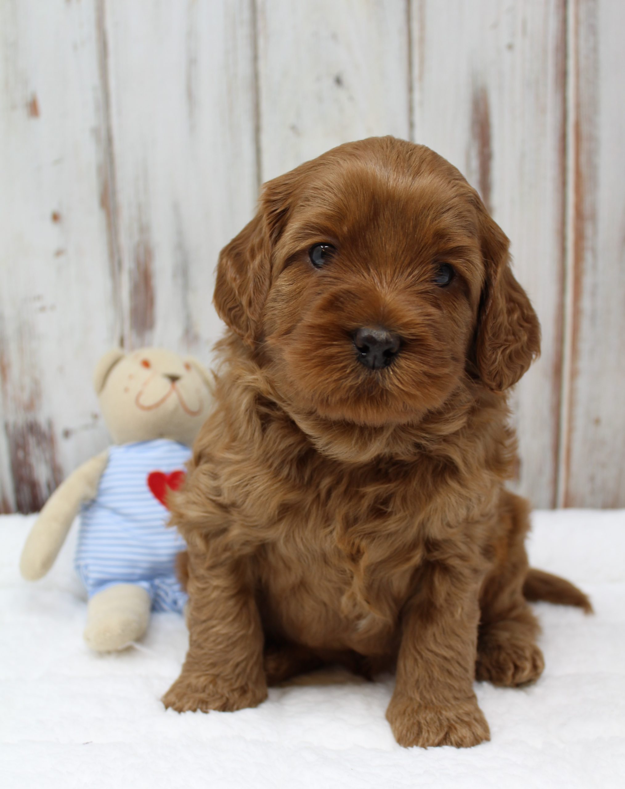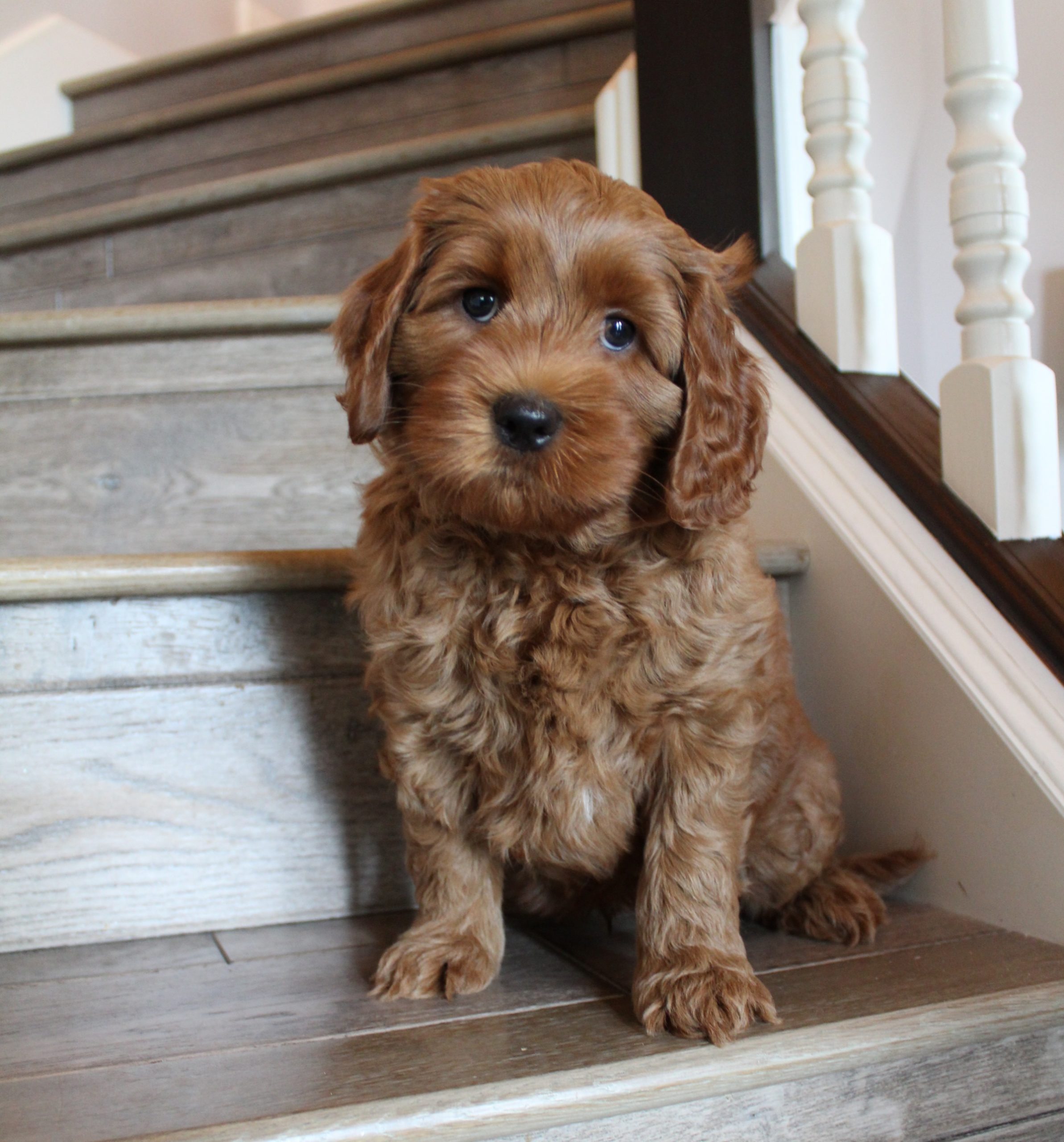 April 21, 2020 – Gretel and Barkley’s puppies are five weeks old, eating kibble and litter box trained (mostly.) They have teeth, so mama is definitely backing off of nursing and hanging out with them. She stays close by, but they’re learning to become more independent. Gary and Gretchen are the biggest and probably going to be dad’s size (almost 40 lbs.). Gus is smaller than any of the others (probably be around 30 lbs.) and the others are in between. We took new pictures yesterday!