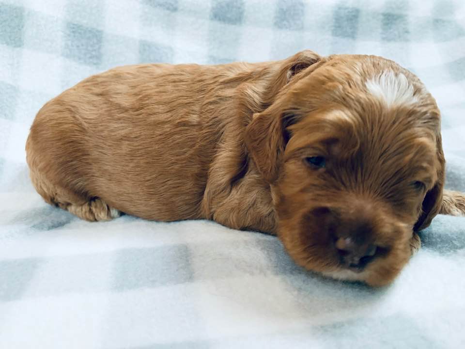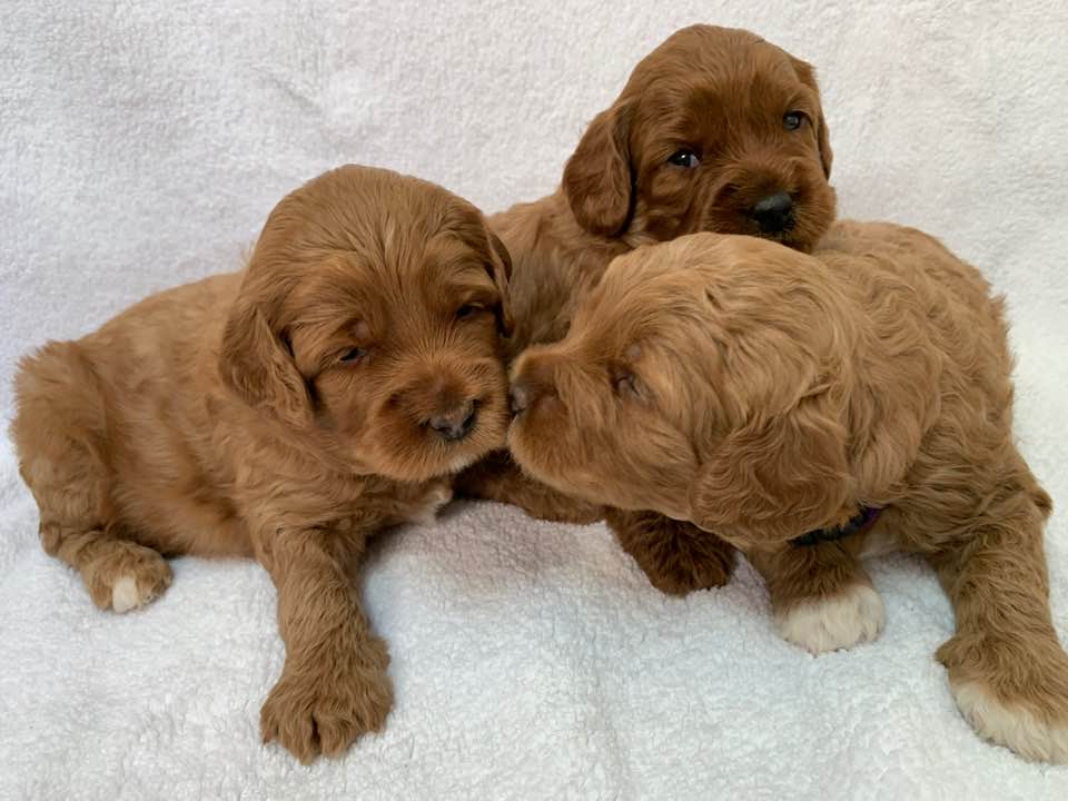 April 13, 2020 – Gretel’s puppies are now a little over four weeks old. They are doing very well. They are good eaters and mama is very attentive. They still sleep a lot, but are starting to wrestle and interact a little more. Soon, we’ll get them into the play area to expand their world and their confidence. Today they had baths and then we worked on conditioning them more to blow-drying. They did great! Here are the pictures we took of them today. (Gwen and Gretchen look so much alike! But Gwen has the white boots and Gretchen does not. Good thing we color code each one with a different collar at birth.)