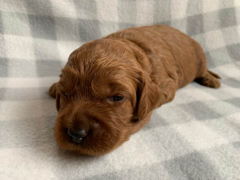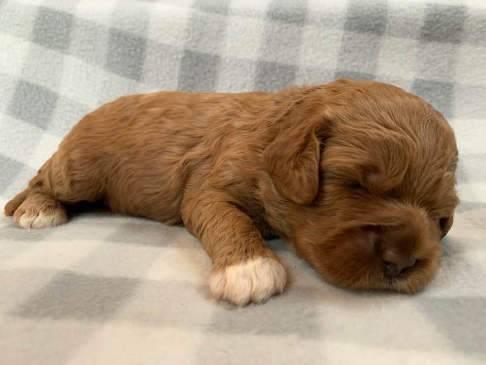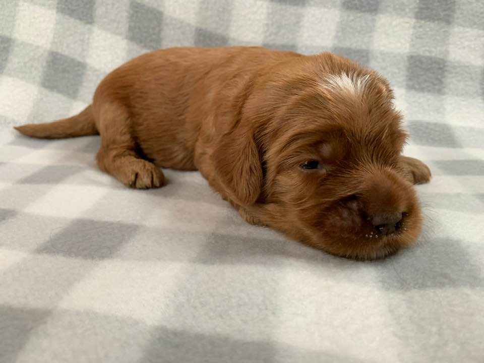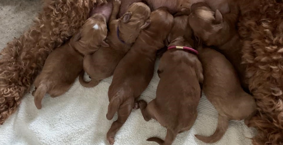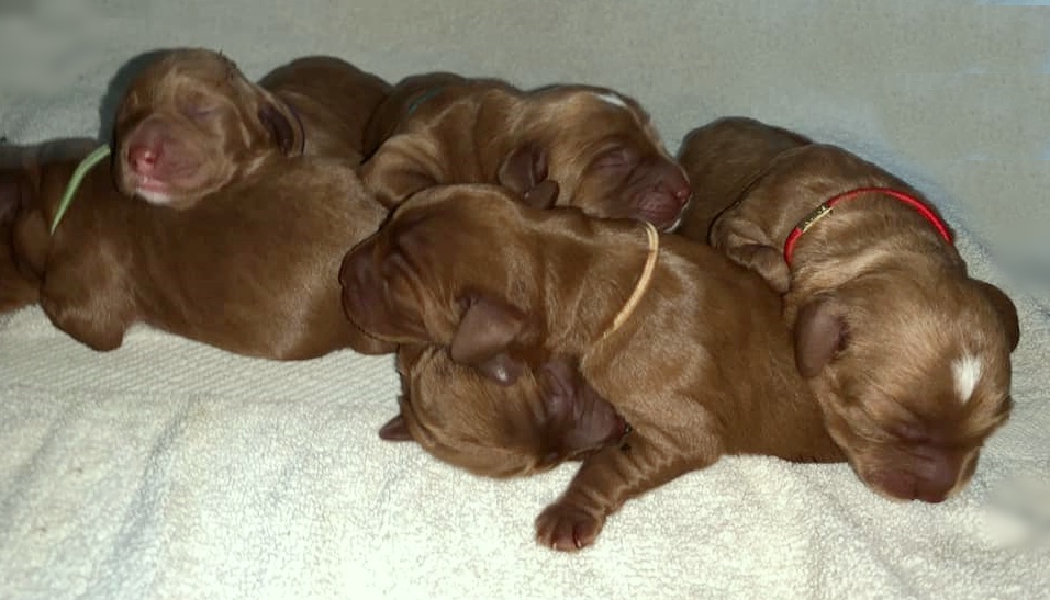March 30, 2020 – Gretel’s puppies are two weeks old and still mostly just sleep and eat. But it won’t be long before they are more alert, hearing and moving around. Gretel is a great mama and attentive to their every need and mostly, they don’t need to move much when there’s a litter of six and plenty of food to go around. Their eyes are open now, but still they are pretty sleepy. Once they are more active and playing and wrestling, we’ll start posting them on Instagram and Facebook. Next week we will see them change a lot. Here they are at two weeks old!