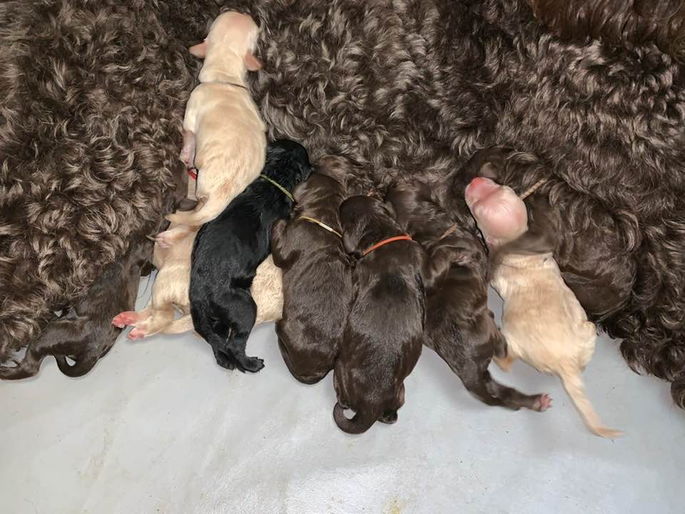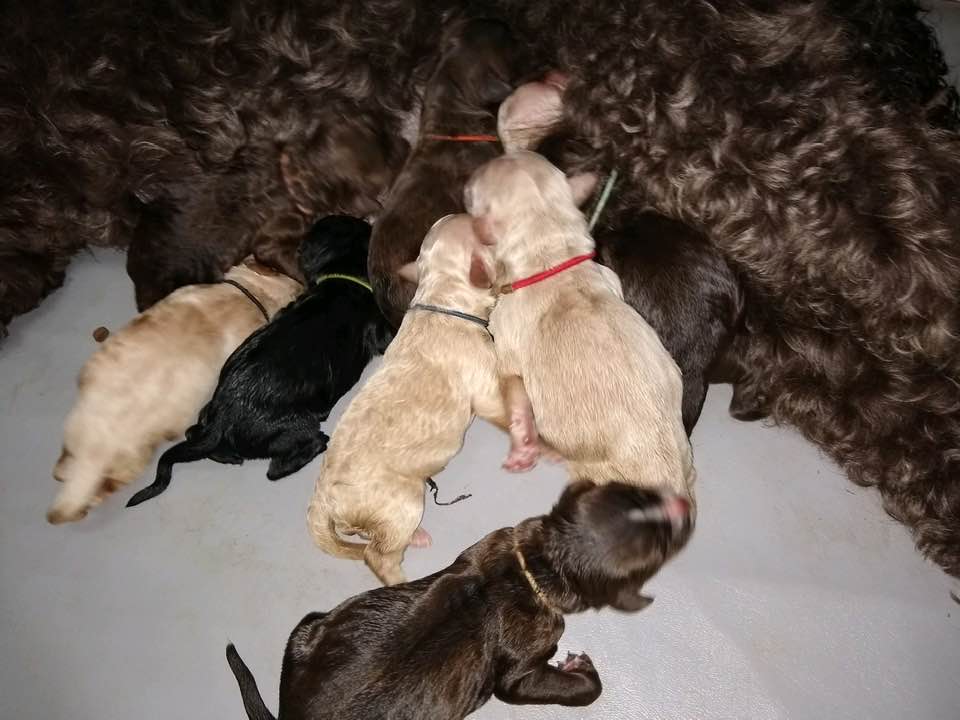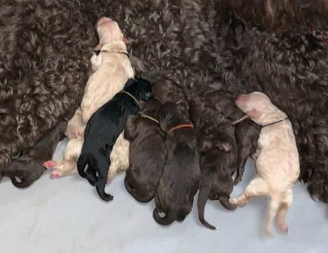 Here is the detail on the litter. Four cream-apricot girls, three chocolate girls, one black boy, two chocolate boys (one with white markings).