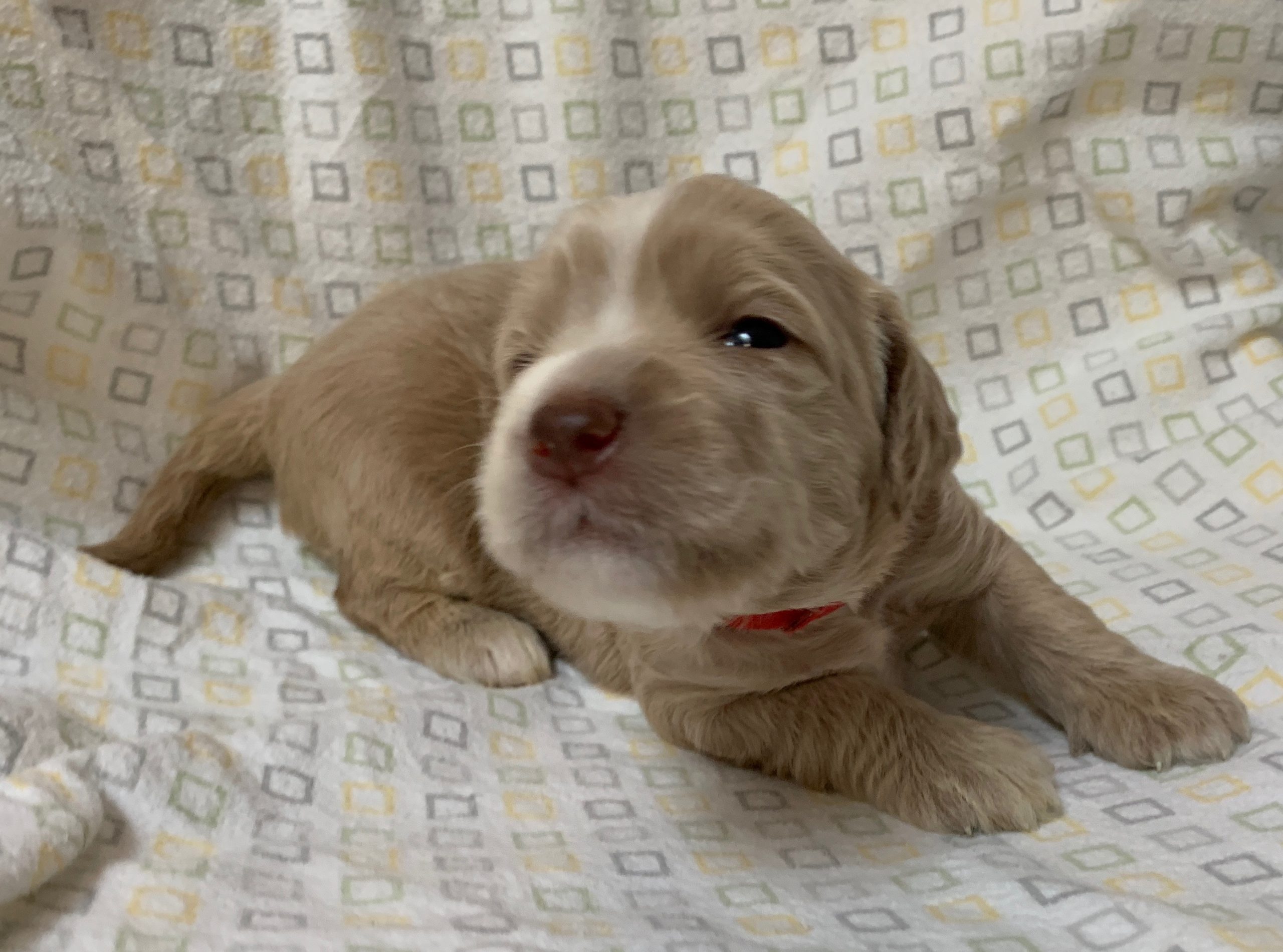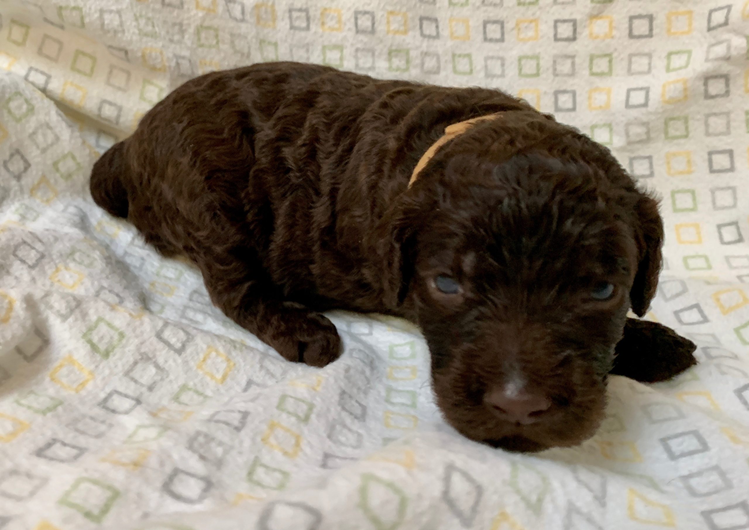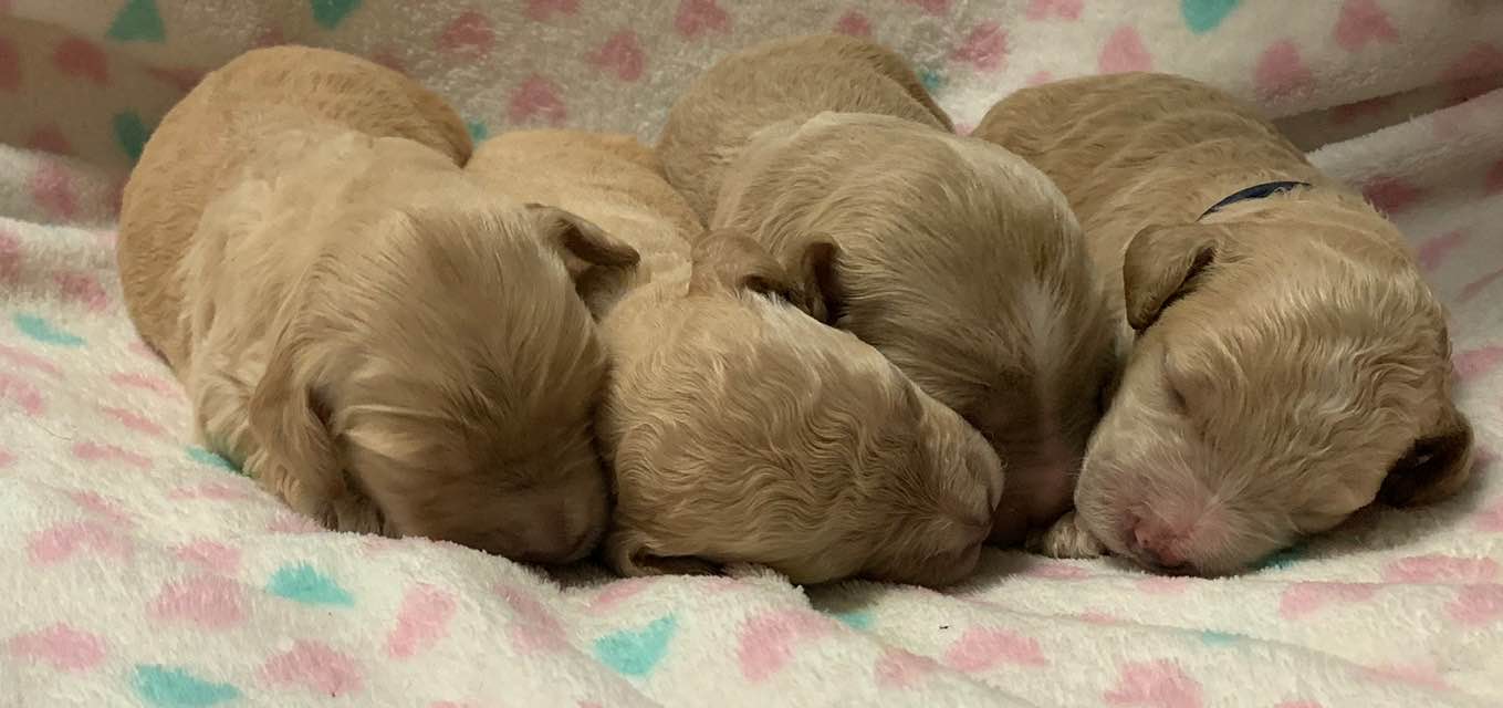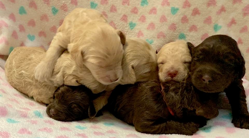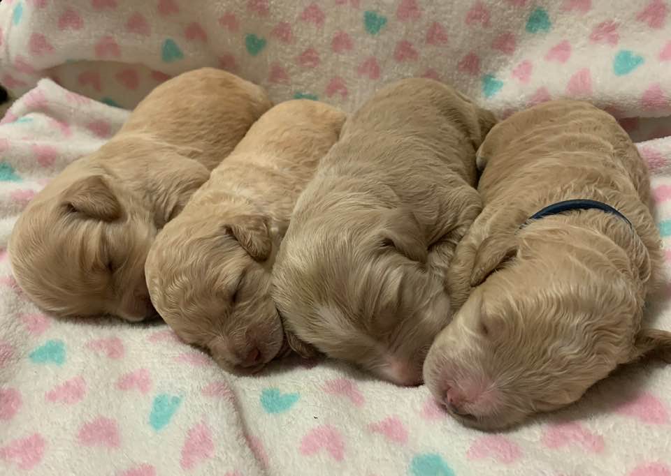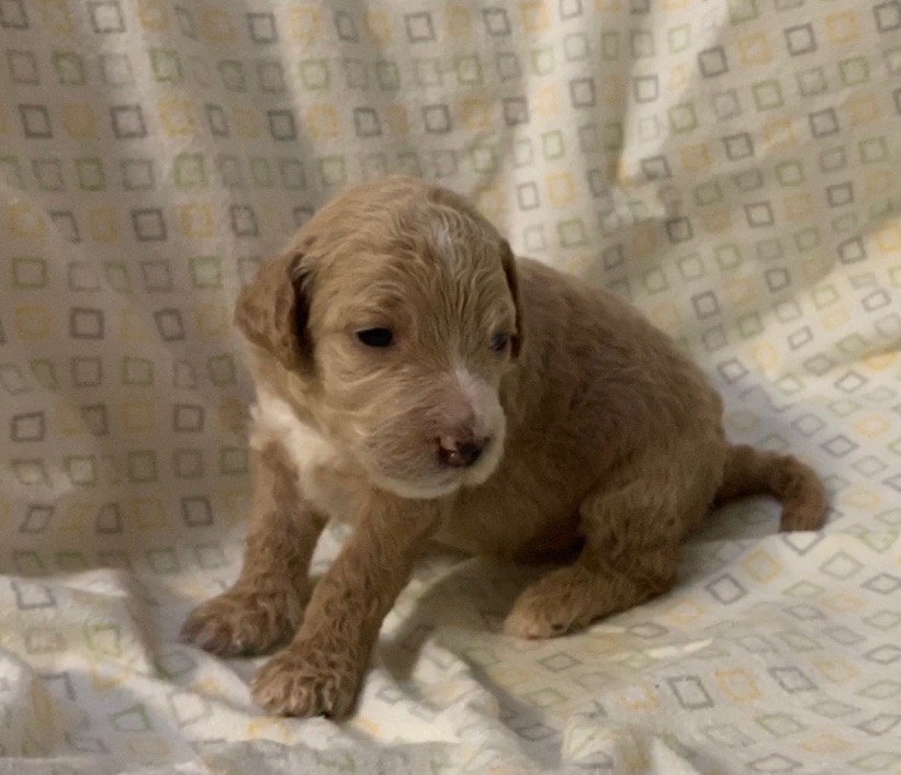 Teeth: Several of the pups have what is called “baseline narrow” teeth and that matters with some breeds, but with the labradoodle, our vet says this is very common, especially in the larger size (we find this in almost every standard size litter we have). Not to be confused with an overbite or an underbite, and we have never had a pup in all these years where it didn’t resolve itself as the teeth continue to develop and the adult teeth come in. Our warranty covers teeth issues, so no worries. I would never NOT choose a pup you love, because his baby teeth are showing to be baseline narrow. The following pups have baseline narrow teeth that are still developing: Loraine, Lulu and LIndsey.