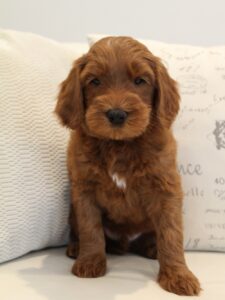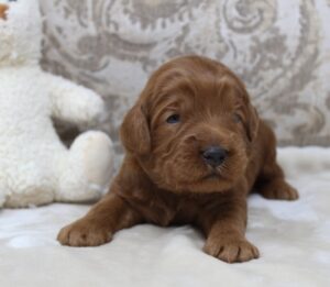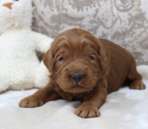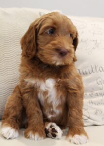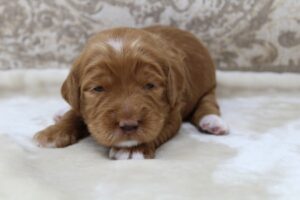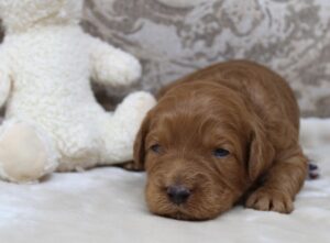 Saylor – Saylor is a little more sensitive than the others. Perhaps still maturing in some areas. He’s a little less confident, and definitely a follower, not dominant or alpha in any way. I think he’ll grow in areas of confidence with new sights and experiences over the next week or two. He’s definitely not shy of people in any way! He is very social just like the rest. We only see his lack of confidence come out when he’s taken to a new room or to the patio and he seems more hesitant than the others. He takes a little longer to settle down in the crate by himself. Just some examples that he is a little less sure of himself. He’ll get there though! We expect him to be around 40-45 lbs.