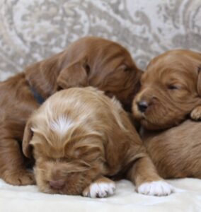 All of the pups scored well on their temperament testing, as we expected. Over all the years that we’ve done the testing, we find that they score so similar! We mainly use it for us, to determine that we haven’t missed anything. It can help us hone in on an area the pup needs a little more attention during their final week with us. We saw that every single pup has completed their conditioning here! Experts say that the temperament testing we do secures that we’ve laid an excellent foundation, but is not necessarily an indicator for their overall temperaments as adults. We always tell our families that they will also play a key role in the personalities and temperaments as they raise their pups into adulthood. Being consistent, calm, and rewarding good behaviors, along with following through on socialization and crate training throughout puppyhood is vital. Protecting them from trauma as they go in and out of fear stages over the upcoming weeks and months is important. A good balance of human time, mixed with naps and night time in crates will be important.