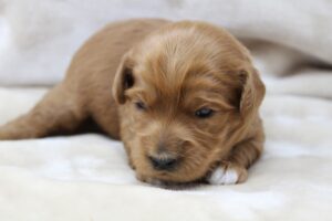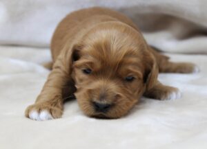 March 25, 2024 – We’re excited to announce this litter – Nelson’s first, and we are happy that all of the pups are thriving and growing fast. The pups are two weeks old (born on March 8, 2024) and you can watch this blog spot weekly to see them grow and know what’s going on here. We’ve named this litter The Z Litter, and we welcome to our world: Zach, Zeb and Zoey. Here they are at a little over two weeks old, and their eyes opened today so it was good timing to post their first pictures!
